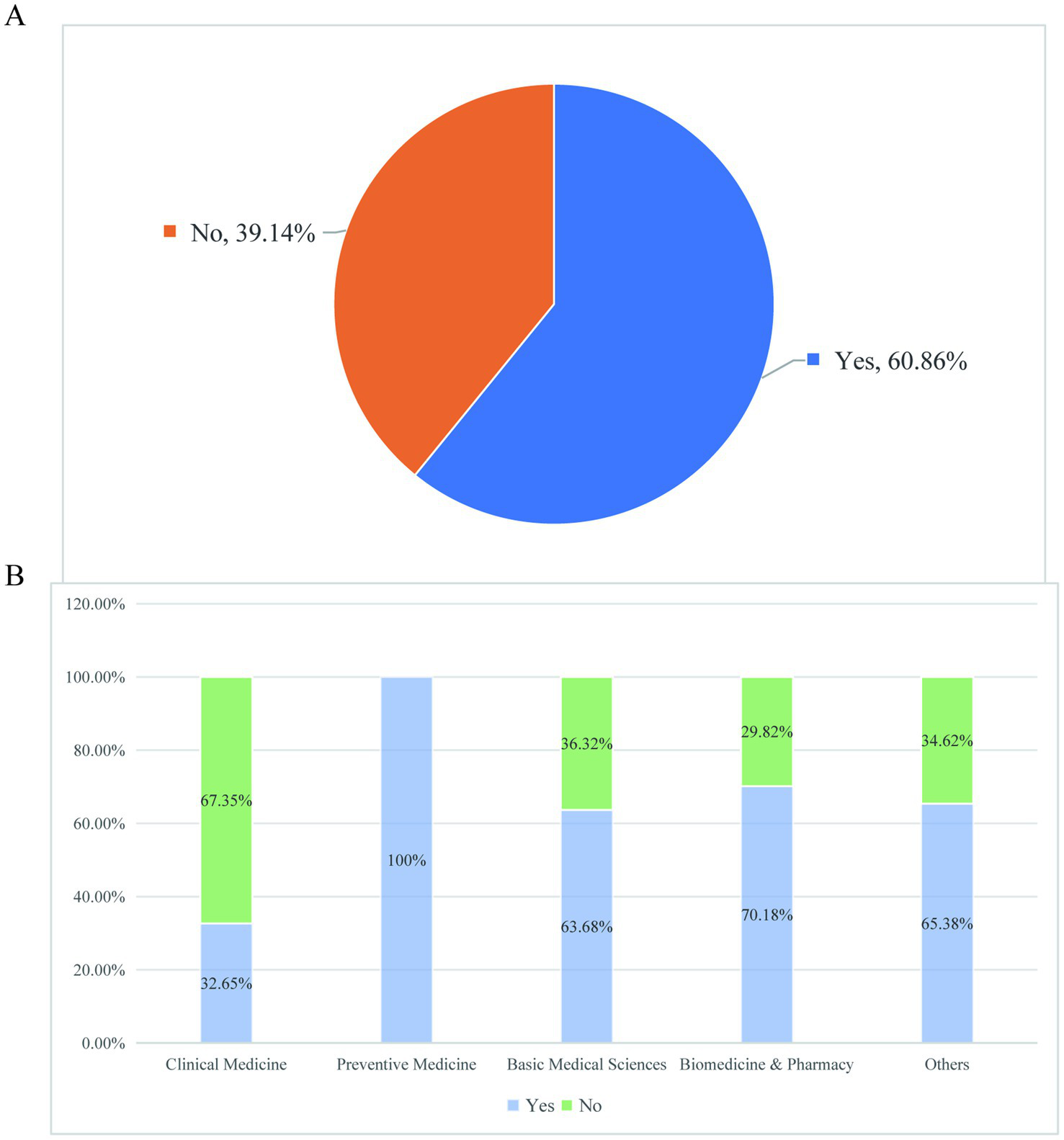 Current status of scientific research experience before admission. (A) The proportion of graduate students who have previously been exposed to research work before admission. (B) The proportion of graduate students in basic medicine from different undergraduate majors who received research training before admission.