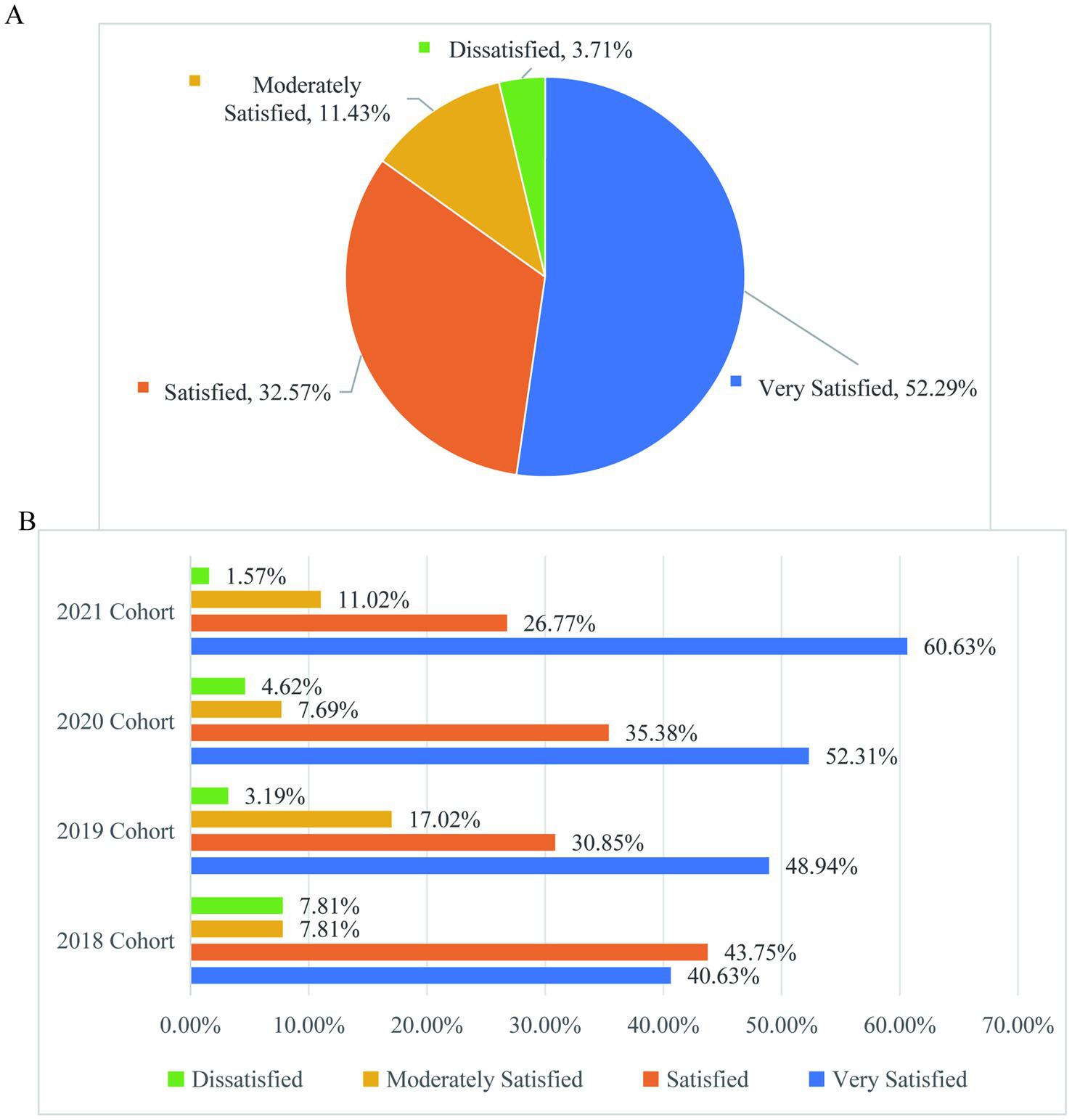 Figure 10 of the survey results show that the overall satisfaction of graduate students with the scientific research academic guidance of their supervisors reaches 96.29% (Figure 10A). The proportion of graduate students in different grades who are very satisfied with the scientific research academic guidance of their supervisors exhibits a downward trend with the increase of cohorts (Figure 10B). It is recommended that supervisors pay increased attention to the guidance of senior graduate students. When considering these findings in relation to Figure 8C, it becomes evident that reasons for not participating in research activities include a lack of intrinsic motivation, self-directed learning skills, and possibly time management issues. This suggests that educational institutions at all levels pay attention to the continuous and targeted optimization of supervisor guidance, including fostering intrinsic motivation and self-directed learning skills among graduate students. Establishing a dynamic guidance evaluation mechanism can ensure that graduate students at different stages can obtain high-quality guidance. Additionally, promoting a culture of self-directed learning could help students take more initiative in their research activities, thus improving their satisfaction with academic support from their supervisors.