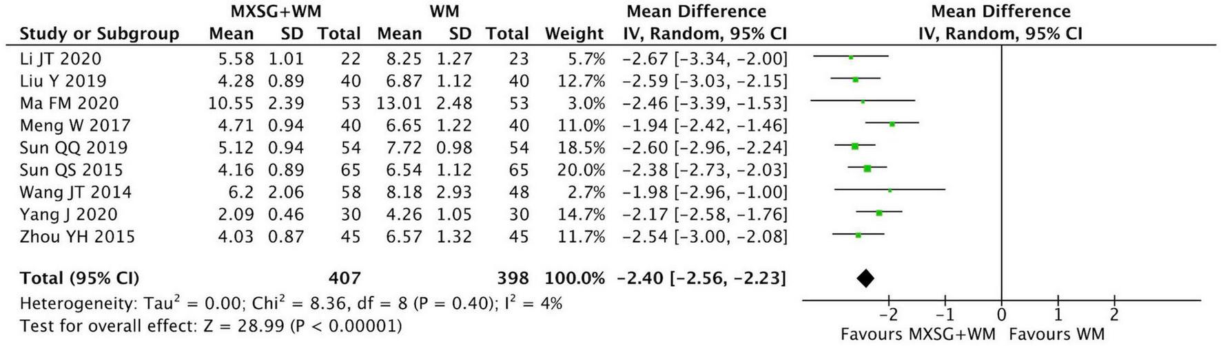 We included 81 RCTs with 6682 participants in total. Compared with western medicine (WM) alone, MXSG plus WM showed a more beneficial effect on reducing the duration of fever (MD = −1.58 days, 95% CI: −1.88 to −1.29, p < 0.00001), cough (MD = −2.30 days, 95% CI: −2.61 to −1.99, p < 0.00001), phlegm (MD = −2.40 days, 95% CI: −2.56 to −2.23, p < 0.00001), dyspnea (MD = −2.11 days, 95% CI: −2.73 to −1.49, p < 0.00001), pulmonary crepitation (MD = −2.13 days, 95% CI: −2.47 to −1.79, p < 0.00001) and length of hospitalization (MD = −1.38 days, 95% CI: −2.54 to −0.23, p = 0.02). Furthermore, MXSG plus WM was significantly superior to WM in promoting the absorption of lung inflammation (MD = −3.31 days, 95% CI: −4.17 to −2.46, p < 0.00001) and improving forced expiratory volume in the first second (MD = 0.54 L, 95% CI: 0.21 to 0.87, p = 0.001). The incidence of adverse events was 3.60% in MXSG plus WM group and 5.38% in WM group, but the difference was not significant (p = 0.06).
