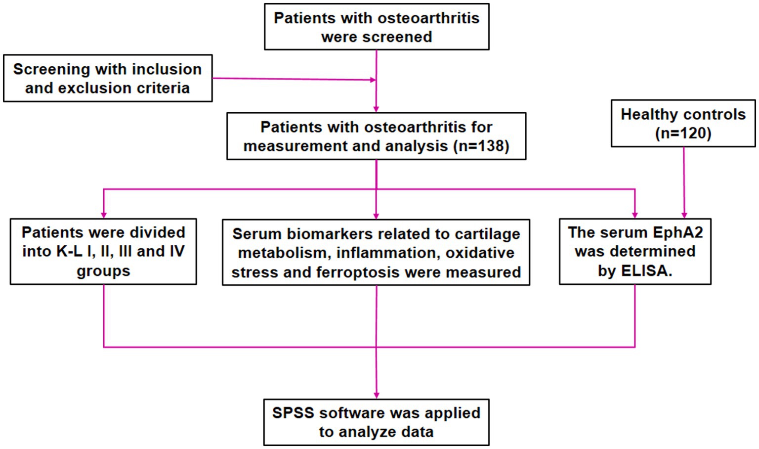 A total of 258 participants (138 patients with knee OA and 120 healthy controls) were included from the Department of Orthopedics in our Hospital between January 2023 and December 2024. Healthy controls were selected from subjects who underwent physical examinations and had matched age and sex. All patients with knee OA were diagnosed according to the criteria of the American College of Rheumatology (15). The inclusion criteria were as follows: (i) all patients were diagnosed with primary knee OA; (ii) all patients were >18 years old; (iii) all patients had radiological evidence of OA, and were divided according to the Kellgren-Lawrence (K-L) score of I-IV. There were 38, 43, 35, and 22 cases of grades I, II, III, and IV, respectively, in this study. Extensive exclusion criteria were applied to reduce potential confounding factors that could affect the study results. The exclusion criteria were as follows: (i) clinically evident OA affecting other joints (e.g., hip); (ii) secondary OA or rheumatoid arthritis; (iii) coexisting autoimmune disorders, systemic inflammatory conditions, severe infections, malignant neoplasms, or significant cardiac, hepatic, or renal impairment; (iv) receipt of intra-articular injections within the preceding week, or immunotherapy or anti-inflammatory therapy within the preceding 3 months; and (v) a documented history of knee injury or surgical intervention. This study complied with the Declaration of Helsinki and was approved by the hospital ethics committee. Participant recruitment was concluded on December 31, 2024; all biomarker assays and statistical analyses were completed during the first half of 2025, once the data were locked. Figure 1 illustrates an overview of the study’s framework.