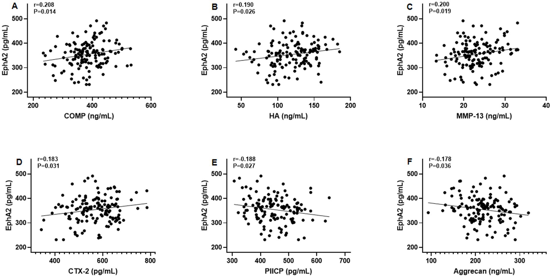 Figure 3. Correlation between serum EphA2 levels and serum indicators of cartilage metabolism. Pearson correlation test was performed between EphA2 and (A) COMP, (B) Hyaluronan (HA), (C) MMP-13, (D) CTX-2, (E) PIICP, and (F) aggrecan in all osteoarthritis patients.