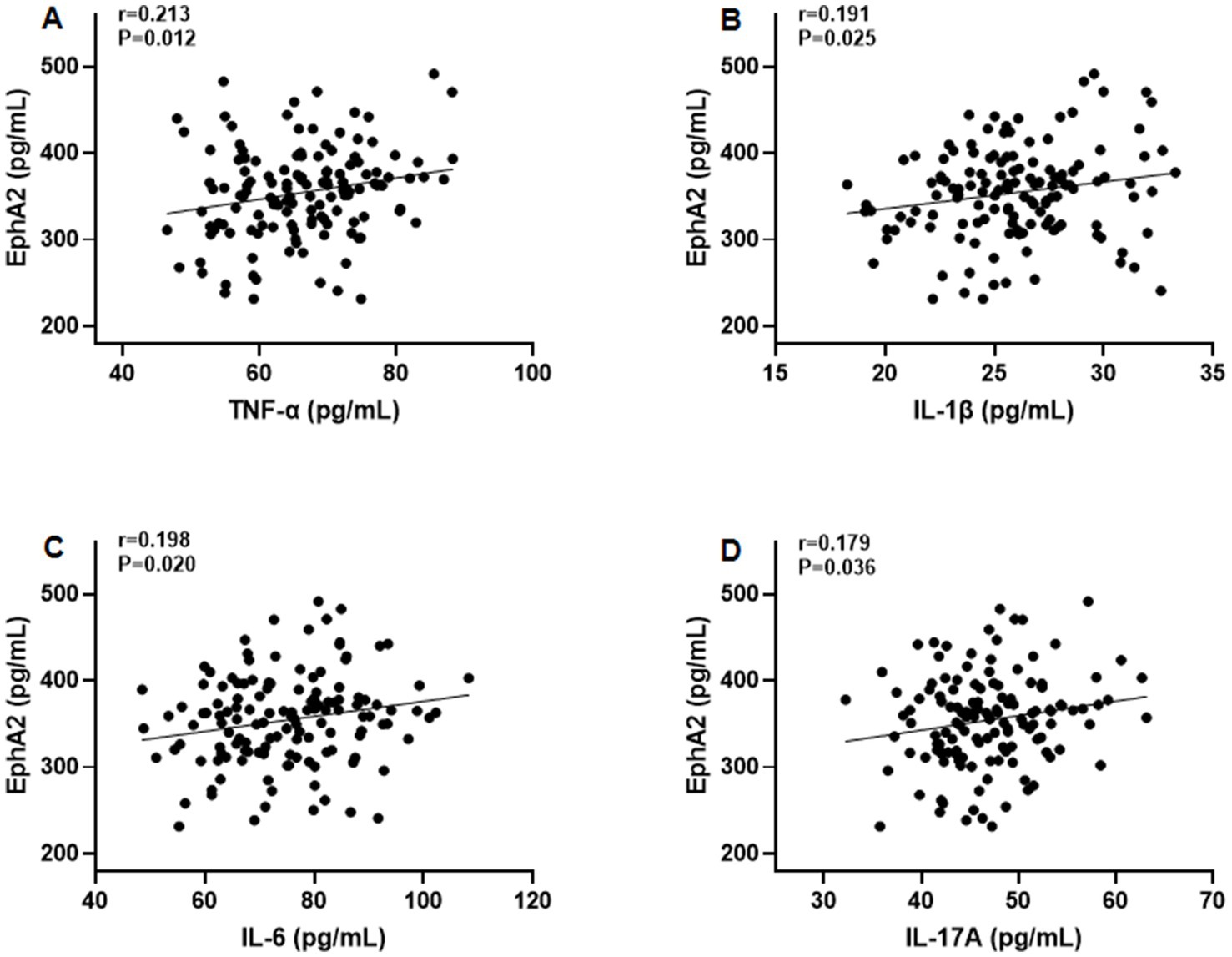 Figure 4. The correlation between serum EphA2 levels and serum inflammatory cytokines. Pearson correlation test was performed between EphA2 and (A) TNF-α, (B) IL-1β, (C) IL-6, and (D) IL-17A in all patients with osteoarthritis.