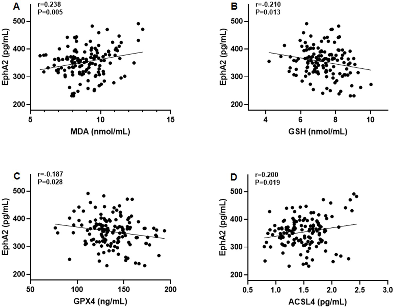 Figure 5. The correlation between serum EphA2 levels and serum indicators of oxidative stress and ferroptosis. Pearson correlation test was performed between EphA2 and (A) MDA (B) GSH (C) GPX4, and (D) ACSL4 in all patients with osteoarthritis.