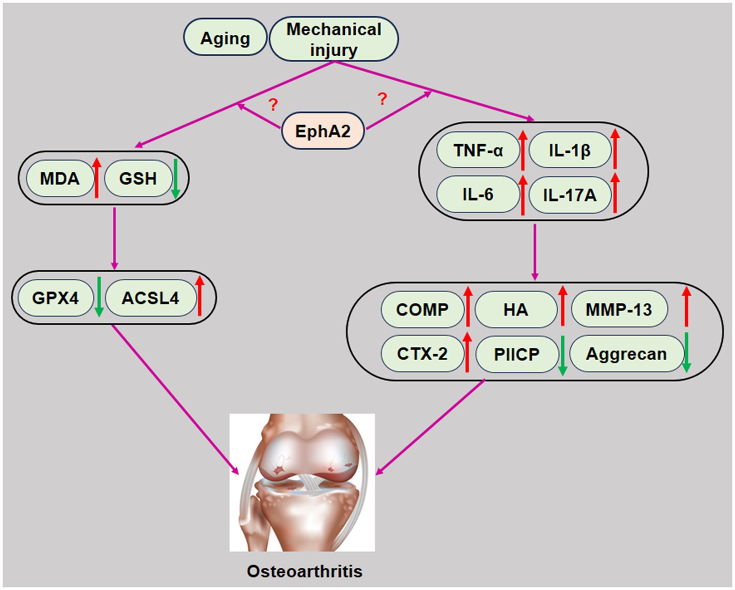 Figure 6. Schematic representation of EphA2 in the development of osteoarthritis. Increased EphA2 levels in patients with osteoarthritis promote chondrocyte injury by promoting inflammation, oxidative stress, and ferroptosis, resulting in abnormal cartilage metabolism. Therefore, increased serum EphA2 levels play an aggravating role in chondrocyte injury in patients with osteoarthritis.