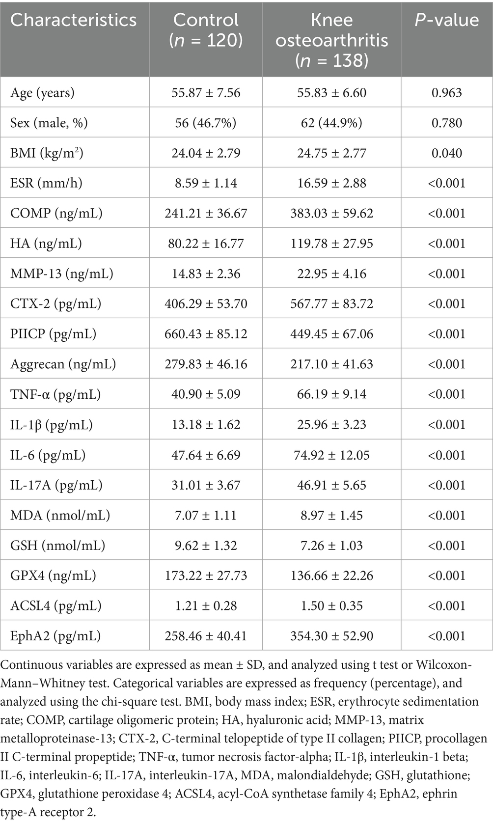 The blood samples were collected from 138 patients with knee OA and 120 healthy controls. Blood was drawn into serum separation tubes (SSTs) containing a clot activator, allowed to clot at room temperature, and centrifuged at 3,000 rpm for 10 min to separate the serum. The resulting serum was aliquoted and stored at −80 °C until analysis to preserve biomarker stability (18). Serum EphA2 (ml038095, Shanghai Enzyme-linked Biotechnology, Shanghai, China), COMP (DCMP0, R&D Systems), Hyaluronan (HA) (DHYAL0, R&D Systems), MMP-13 (SEKH-0259, Solarbio, China), CTX-2 (ml105642, Shanghai Enzyme-linked Biotechnology, Shanghai, China), PIICP (AB5126, EK-Bioscience), aggrecan (DY1220, R&D Systems), TNF-α (DTA00D, R&D Systems), IL-1β (DLB50, R&D Systems), IL-6 (D6050B, R&D Systems), IL-17A (D1700, R&D Systems), MDA (EU2577, FineTest), GSH (ml038257, Shanghai Enzyme-linked Biotechnology), GPX4 (ml060706, Shanghai Enzyme-linked Biotechnology), and ACSL4 (EH6088, FineTest) levels were measured using an ELISA kit, and absorbance at 450 nm was assessed using a microplate reader and each experiment run in duplicate (19). All assays were performed by laboratory personnel who were blinded to the participants’ clinical status and K-L grade.