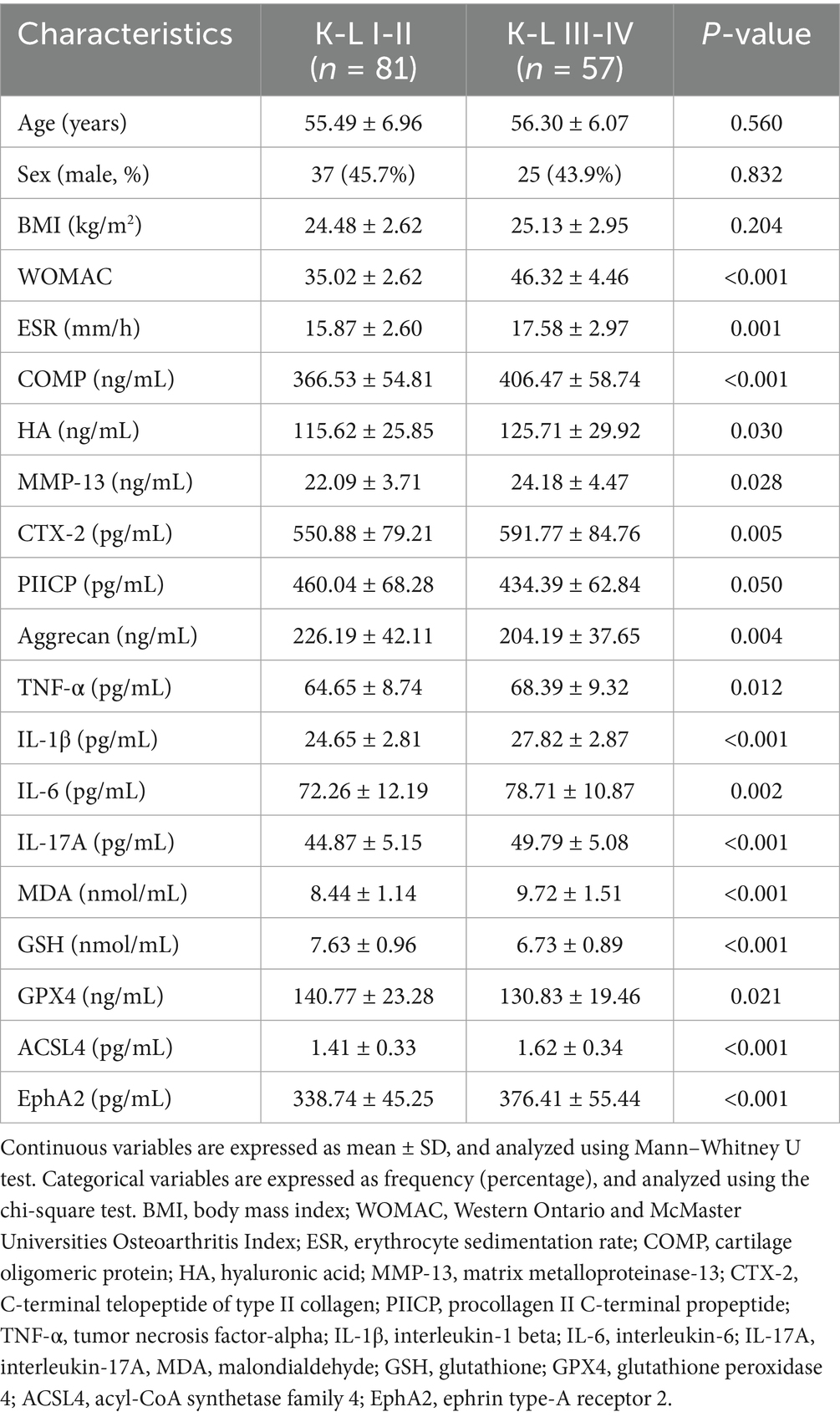 Furthermore, we performed the Mann–Whitney U test to compare K-L grades I-II (n = 81) and K-L grades III-IV (n = 57) in patients with knee OA (n = 138) based on the Kellgren-Lawrence (KL) score. The results showed that K-L III-IV knee OA patients showed significantly elevated levels of different health indicators, including the Western Ontario and McMaster Universities Osteoarthritis Index (WOMAC), ESR, COMP, HA, MMP-13, CTX-2, TNF-α, IL-1β, IL-6, IL-17A, MDA, ACSL4, and EphA2, than K-L I-II (Table 2). In contrast, K-L I-II had lower levels of markers such as PIICP, aggrecan, GSH, and GPX4, than healthy controls. However, there were no significant differences in age, sex, or BMI between K-L grades I-II and III-IV (p > 0.05).
