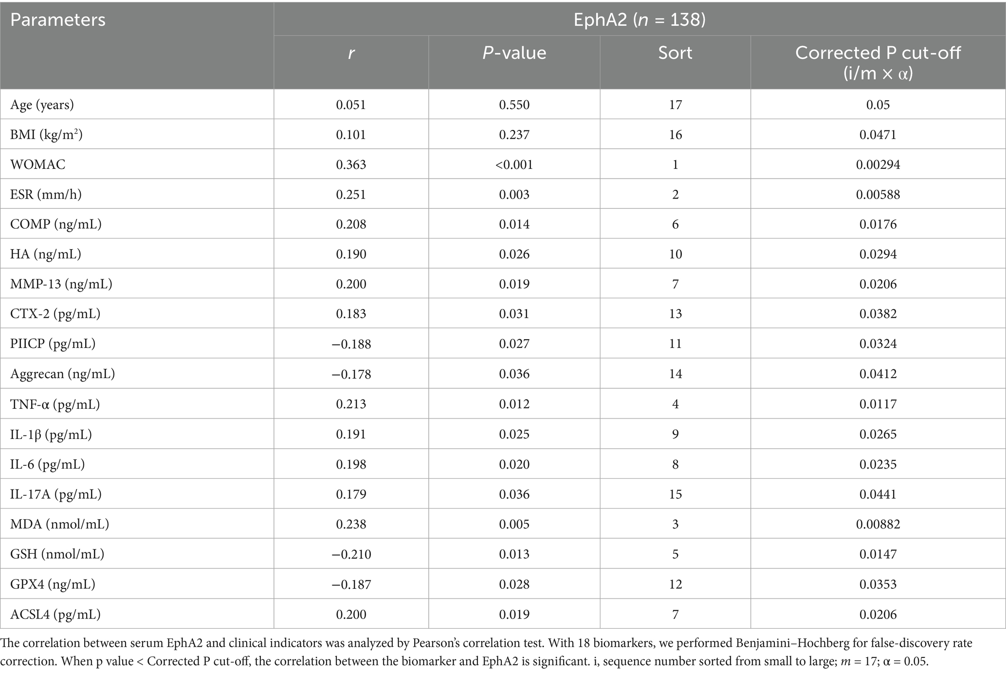 Table 3. Correlation of serum EphA2 with clinical and biochemical parameters in patients with knee OA (n = 138).