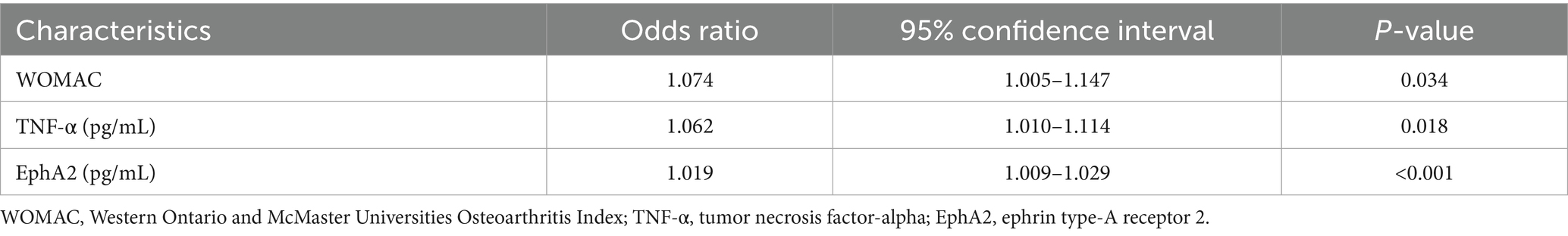 Previous OA biomarker studies have primarily focused on individual catabolic or inflammatory markers, with limited integration of molecular pathways. For instance, CTX-2 and COMP predict OA progression but do not capture the full inflammatory or oxidative profile (20, 21). By integrating cartilage metabolism (MMP-13 and CTX-2), inflammation (TNF-α, IL-1β, IL-6, and IL-17A), oxidative stress (MDA), and ferroptosis markers (ACSL4 and GPX4) with EphA2, our study highlights EphA2 as a central node reflecting multiple aspects of OA pathology. This multi-pathway association distinguishes EphA2 from traditional biomarkers with a single mechanism.