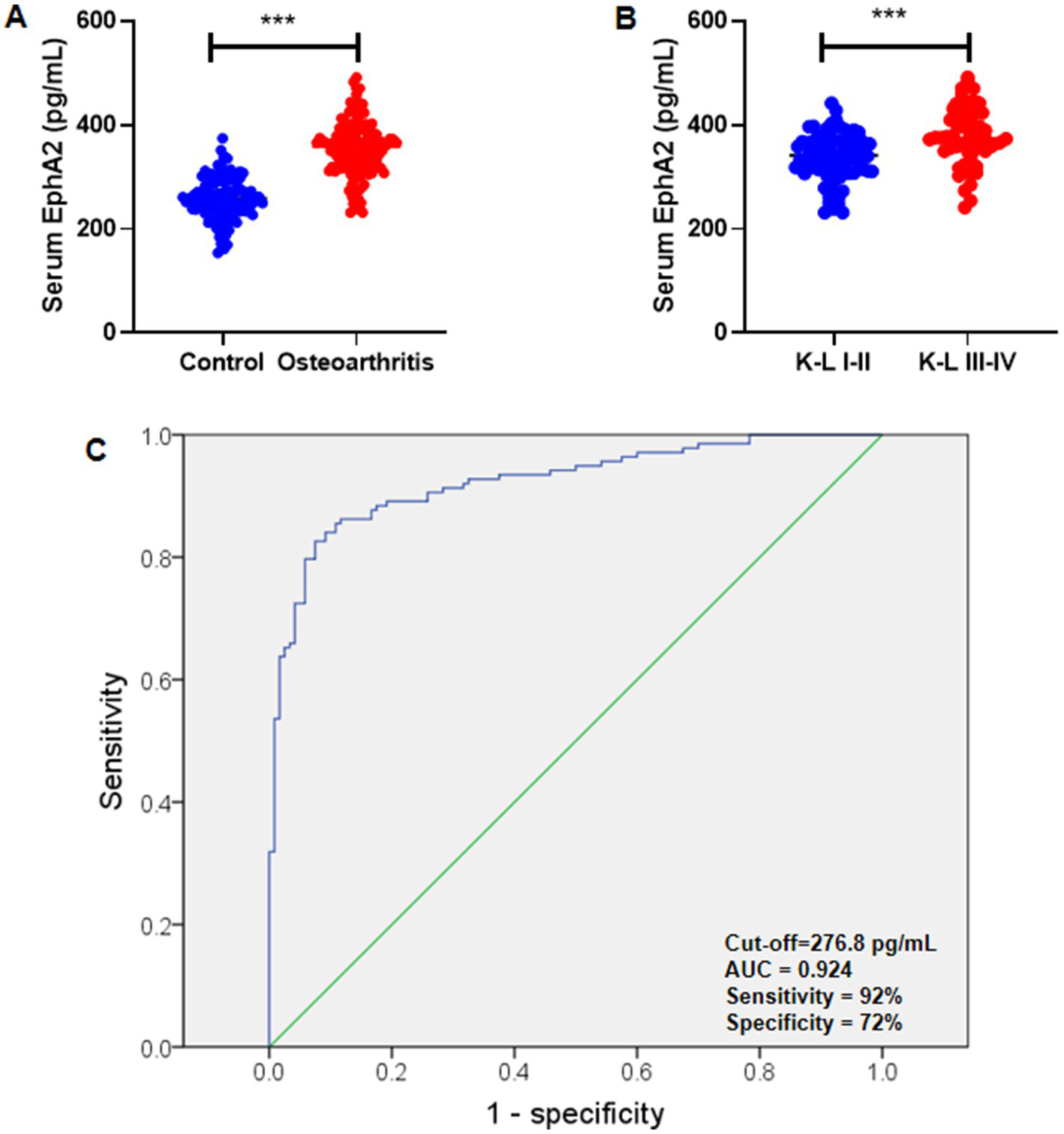 Figure 2. Serum EphA2 were measured in healthy controls and osteoarthritis patients. (A) Serum EphA2 levels were detected by ELISA and compared between healthy controls and patients with osteoarthritis. The serum EphA2 concentration in patients with osteoarthritis (n = 138) was significantly higher than that in healthy controls (n = 120). (B) Serum EphA2 levels were compared between patients with osteoarthritis with K-L scores I-II and K-L scores III-IV. The serum EphA2 concentration in patients with OA with K-L scores III-IV (n = 57) was significantly higher than that in patients with OA with K-L scores I-II (n = 81). (C) The ROC curve was used to obtain the critical point of serum EphA2 levels that distinguished between patients with osteoarthritis and healthy controls. The optimal critical point was 276.8 pg./mL. A t-test was conducted, with significance indicated as ***p < 0.001.