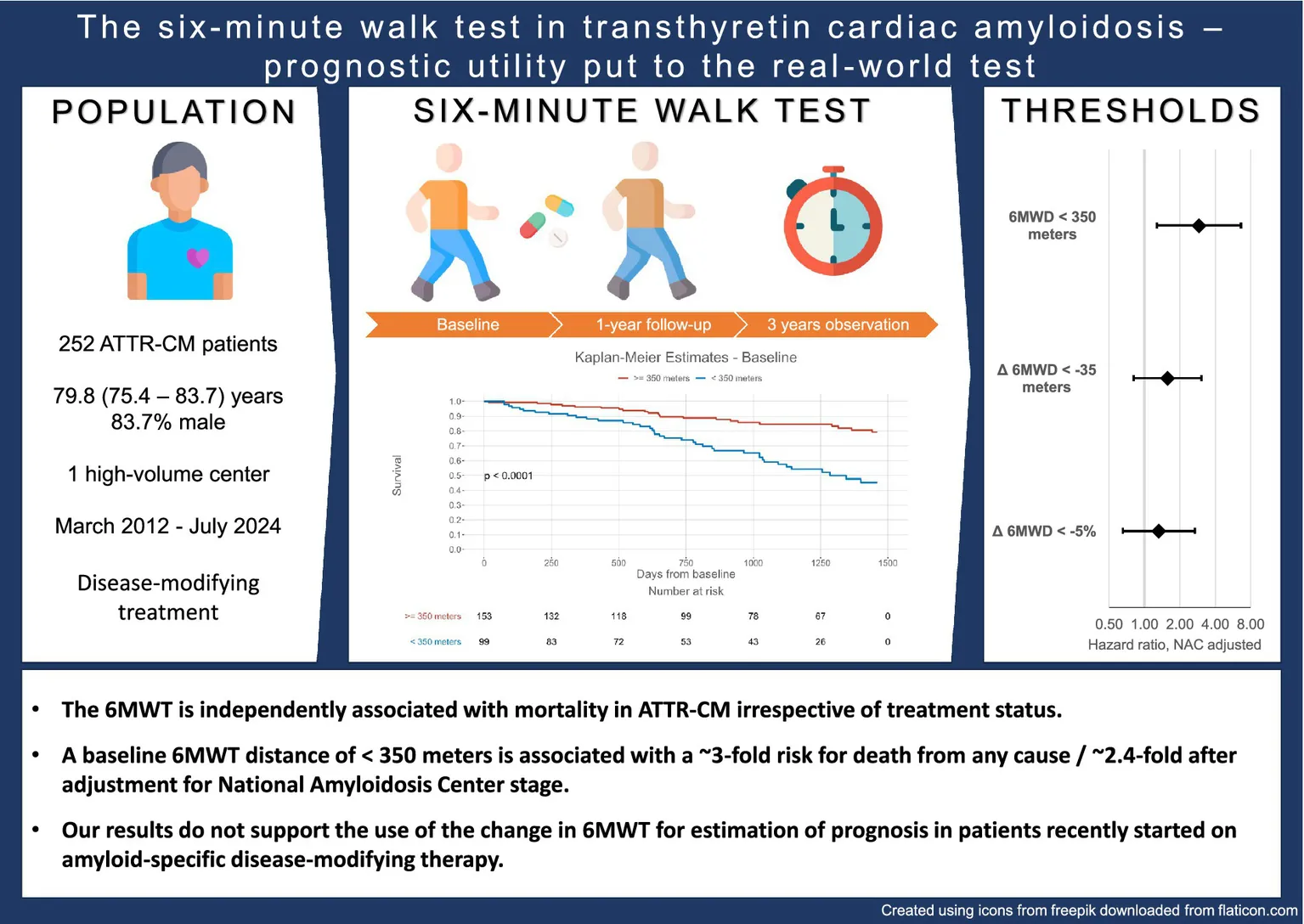 The 6-min walk test distance (6MWD) was identified as a predictor of mortality in transthyretin amyloid cardiomyopathy (ATTR-CM). However, its real-world applicability remains uncertain, as only therapy-naïve patients were included in the primary analysis.