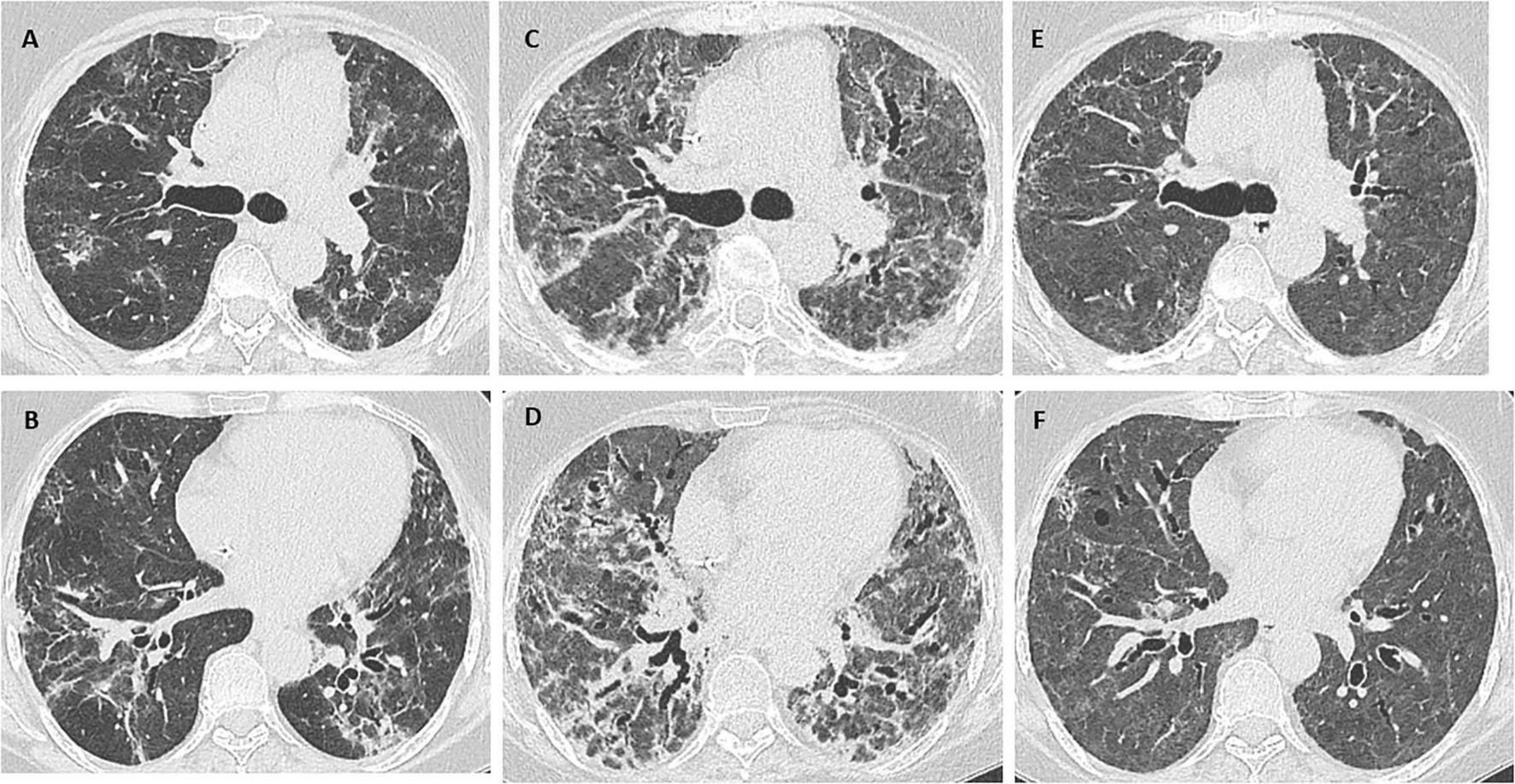 (A,B) Chest CT scan: diffuse opacities in both lung fields, possibly associated with organizing pneumonia or an infectious process in the context of underlying fibrotic interstitial lung disease. (C,D) Marked worsening of the interstitial lung disease with an associated extensive fibrotic component. (E,F) Considerable improvement in interstitial lung disease, with persistent, mildly diffuse ground glass opacity. Note also traction bronchiectasis and bronchiolectasis with no clear areas of honeycombing.