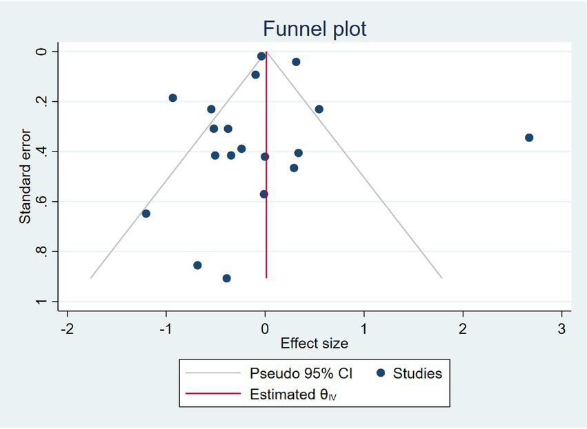 Figure 4 shows the funnel plot of the included studies. Visual inspection of the funnel plot showed a symmetrical distribution of studies around the pooled effect size, suggesting no apparent publication bias. This was further supported by Egger’s regression test (β = −0.55, SE = 0.92, p = 0.55), indicating no significant small-study effects (Figure 5).