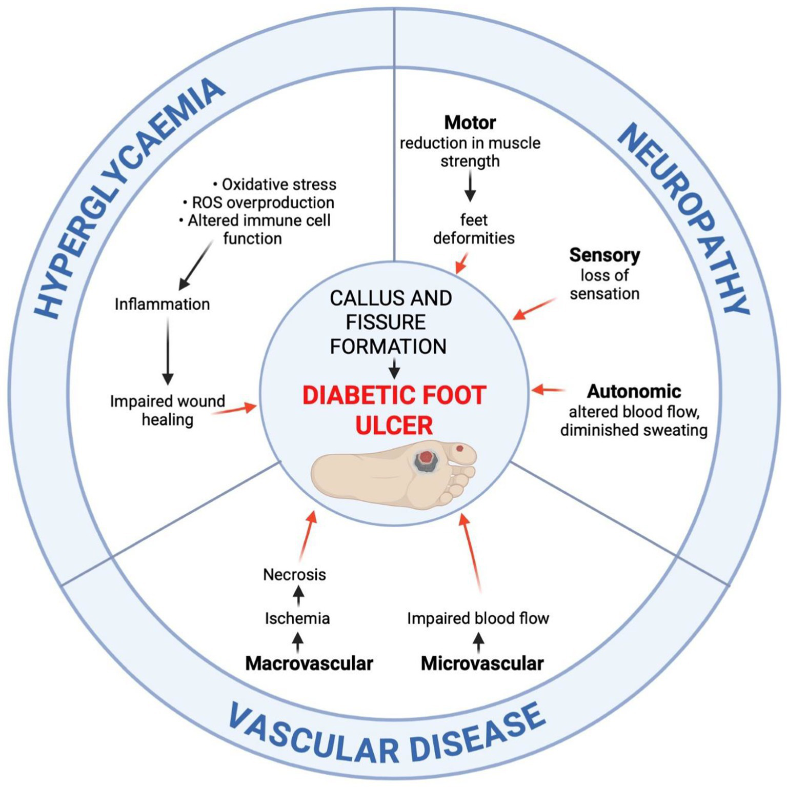 Figure 2. Developmental pathways of diabetic foot ulceration (DFU). The aetiology of DFU involves prolonged hyperglycaemia, peripheral neuropathy, and vascular disease. The prolonged hyperglycaemia impairs the wound healing process due to increased oxidative stress and reactive oxygen species (ROS) overproduction, altered immune cell function and inflammation, endothelial cell damage, impaired neovascularisation, as well as collagen cross-linking deformities. Peripheral motor, sensory, and autonomic neuropathy lead to foot deformities, decreased protective sensation, and skin dryness. Vascular disease accounts for the impaired blood flow, leading to ischemia and necrosis (created in https://BioRender.com).
