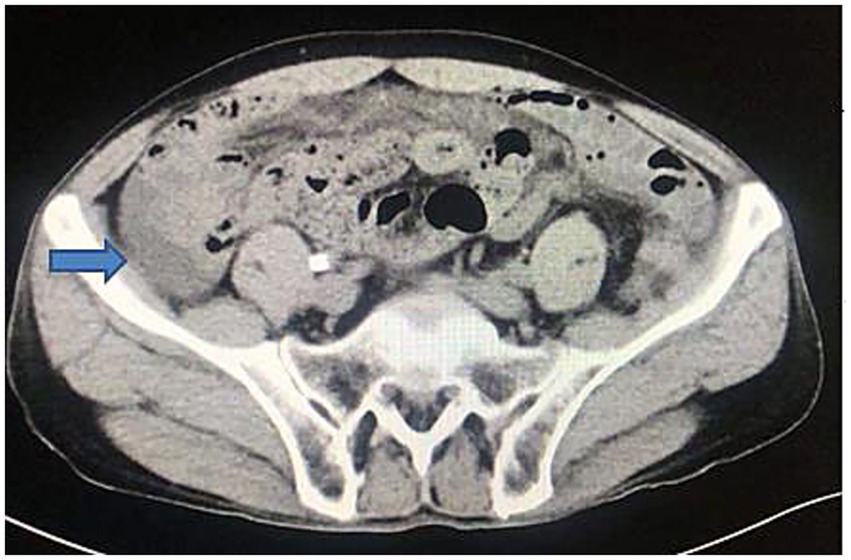 A 70-year-old male presented to our hospital complaining of abdominal pain for 9 h. He had a history of coronary heart disease and had undergone a subtotal gastrectomy (Billroth II type) for gastric ulcer 20 years ago. The patient presented with sudden onset of persistent abdominal pain without an apparent etiology. There were no accompanying symptoms such as fever, nausea, or vomiting, leading to the decision to admit the patient to our emergency department. Upon initial assessment, the patient exhibited alertness and consciousness, with a recorded body temperature of 36.5 °C, blood pressure measuring 130/70 mmHg, a heart rate of 80 beats per minute, a respiratory rate of 22 breaths per minute, and a blood oxygen saturation level of 95% in ambient air. Cardiac and thoracic percussion and auscultation showed no abnormality. The patient demonstrated standard developmental milestones, experienced moderate malnutrition, displayed a troubled demeanor, and was conveyed on a level surface. There was no icterus, pallor, lymphadenopathy, cyanosis, clubbing, edema, and the patient was well hydrated. The abdomen was slightly distended, without abdominal varicose vein, gastrointestinal type, and peristaltic wave. There were slight distention of the whole abdomen, mild tenderness, no rebound pain, and no abdominal muscle tension. The examination revealed no enlargement of the liver, gallbladder, or spleen, and no masses were detected in the groin region. Abdominal percussion yielded a drum-like sound, with no signs of mobile dullness. Auscultation of bowel sounds was weak with no hyperactivity. The digital rectal examination did not touch the mass, and the withdrawal of the finger sheath was not stained with blood. The laboratory findings indicated minor reductions in hemoglobin (106 g/L) and albumin (30.8 g/L) concentrations, while all other assessments remained within normal limits.
