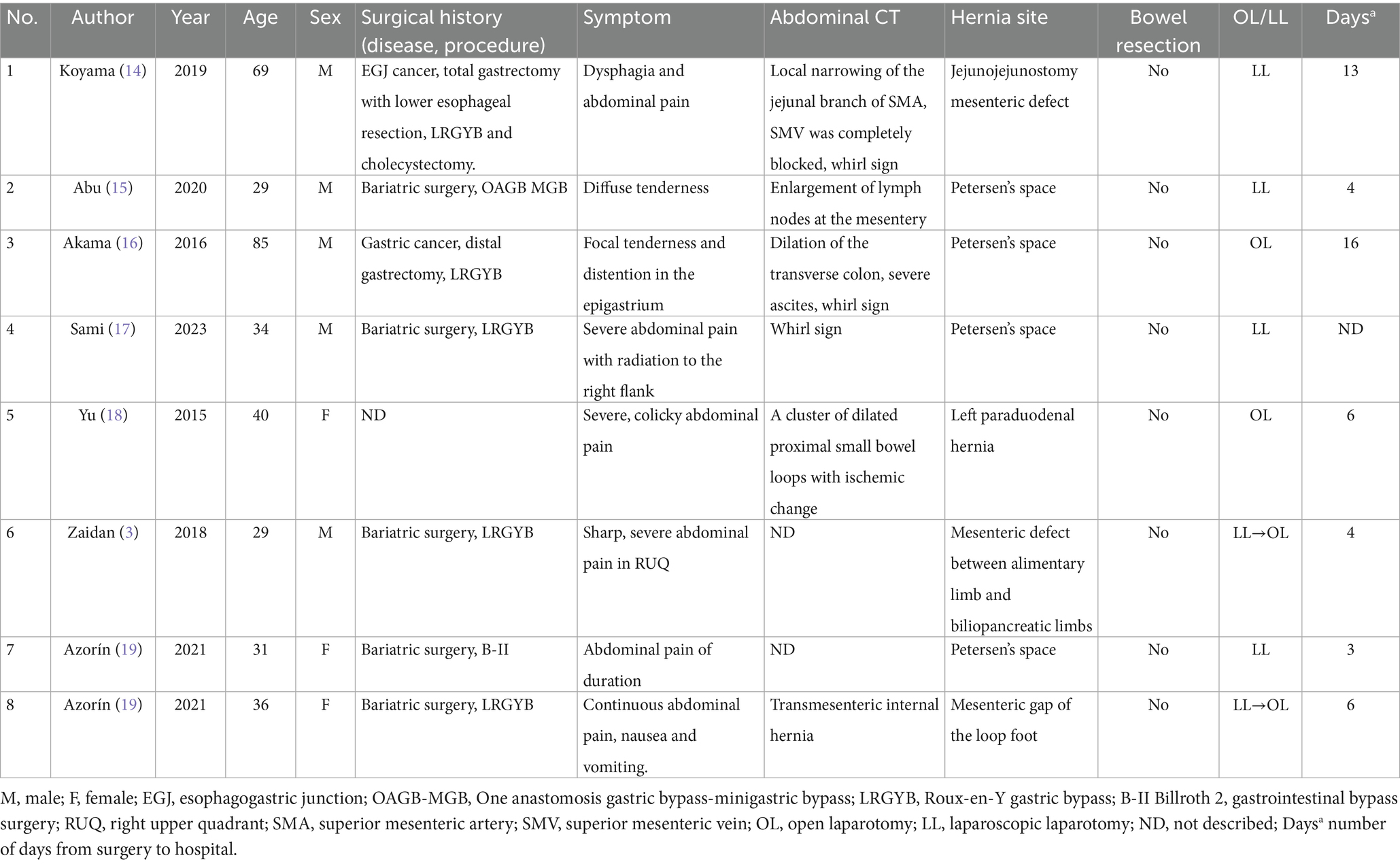 A search of English literature concerning case reports of chylous ascites with internal hernia reveals 8 cases (Table 1) (3, 14–19). Among these cases, there were 5 males and 3 females, with ages spanning from 29 to 85 years (mean age 44.1 ± 19.7 years). Seven of the 8 cases have surgical history. The diseases, operative procedures, symptom, abdominal CT and hernia site are presented in Table 1. The surgical interventions executed comprised five instances of Roux-en-Y gastric bypass, a singular case of anastomosis gastric bypass-minigastric bypass, and one instance of Billroth 2 gastrointestinal bypass surgery. There are three cases of whirl sign in abdominal CT, and four cases of Petersen’s space in hernia site. There is no intestinal necrosis and bowel resection in all eight cases.