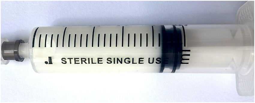 Abdominal computed tomography (CT) revealed mild intestinal dilatation within the abdominal cavity and abdominal fluid accumulation (Figure 1). Abdominal CT showed no tumor and cirrhosis. Abdominal color ultrasound showed no mesenteric vein embolism. A diagnostic abdominal paracentesis was performed, and opalescent ascites were visible (Figure 2). Subsequently, a percutaneous drainage procedure was conducted, resulting in the extraction of 400 mL of chylous fluid. Relevant laboratory tests examined the chylous fluid. The specific gravity of chylous fluid was 1.018, pH was alkaline (pH = 7.62), and protein content was 35 g/L. The cell count was low, with mostly lymphocytes (4.2 × 109/L) and a few neutrophils (0.8 × 109/L). The bacterial culture was negative. Droplets of fat could be seen under the microscope. Chylous fluid had high triglyceride content (3.85 g/L) and low cholesterol content (0.74 g/L), and cholesterol/triglyceride <1.0, leading to the diagnosis of chylous ascites. The patient did not present with any other significant illnesses at the time, prompting the implementation of conservative regimen measures such as water fasting, cefoperazone, somatostatin, and nutritional liquid containing glucose, fat emulsion, amino acids, vitamins, and trace elements. However, the abdominal pain was not relieved after 2 days, with about 600 mL of chylous ascites drained daily. Following the ineffectiveness of previous conservative regimen, laparoscopic exploration was considered the subsequent course of action.