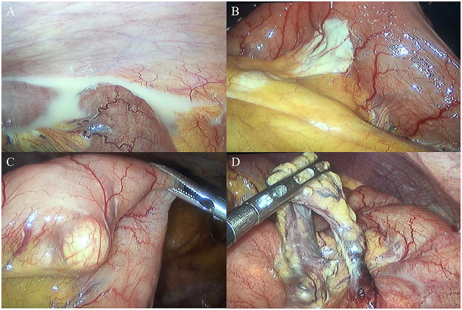 Laparoscopic aspect (A). Chylous ascites can be seen in the abdominal cavity (B). Scattered white patches in the mesentery (C). White bulges in the mesentery (D). An adhesive band with internal hernia.