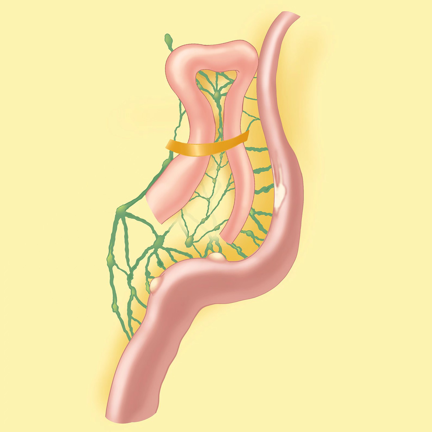 We selected the navel as the observation aperture and the outer boundary of the rectus muscle in the right upper and lower abdomen as the surgical entry point. Through laparoscopic exploration, we found approximately 150 mL of chylous ascites (Figure 3A) in the abdominal cavity, in addition to scattered white patches (Figure 3B) and white bulges (Figure 3C) in the mesentery, but no rupture was found. No perforation sites were identified in the stomach, small intestine, or colon. Both ends of the adhesive band (Figure 3D) were fixed at the mesentery about 1.5 m from the Treitz ligament, and an internal hernia formed. The small intestine, with a length of approximately 20 cm, exhibited herniation adjacent to the adhesive band, while the proximal segment of the small intestine displayed slight dilation. A simplified anatomical schematic was added to illustrate the hernia location and its relationship to lymphatic drainage (Figure 4). All the chylous fluid present within the abdominal cavity was evacuated. The adhesive band was meticulously severed at both ends along the root using a Johnson ultrasonic knife, subsequently extracted from the body via laparoscopic trocar. No intestinal necrosis was present, so enterectomy was not performed. The abdominal cavity was irrigated with warm saline until clarification; no active bleeding occurred, and no chylous fluid continued to effuse. A rubber tube was placed in the pelvic cavity for drainage and was extracted from the right abdominal wall. The chylous fluid was excised, the internal hernia was addressed, and the surgery completed. The patient underwent postoperative water fasting and received cefoperazone, somatostatin and intravenous nutrition treatment containing glucose, fat emulsion, amino acids, vitamins, and trace elements. On the first day following surgery, 50 mL of light red chylous fluid was drained from the abdomen through the drainage tube; on the second day, 30 mL of light yellow fluid was discharged. Relevant laboratory tests examined the ascites on the second day. The specific gravity of chylous fluid was 1.017, pH was weakly alkaline (pH = 7.42), and protein content was 25 g/L. The number of cells was small, containing most white blood cells (60 × 106/L). The bacterial culture was negative. Droplets of fat could barely be seen under the microscope. The ascites had low triglyceride content (0.32 mmol/L). On the third day, 10 mL of yellow and transparent fluid was drained; on the fourth day, there was no obvious effusion in the abdominal color ultrasound re-examination, and the drainage tube was removed. The patient gradually resumed eating and recovered after surgery. He was discharged on the 7th day after surgery. After 6 months of follow-up, the patient did not complain of any discomfort. The re-examination of abdominal CT showed no obvious abnormalities. A figure showcasing a timeline with relevant data from episode of care is attached (Supplementary Figure 1).