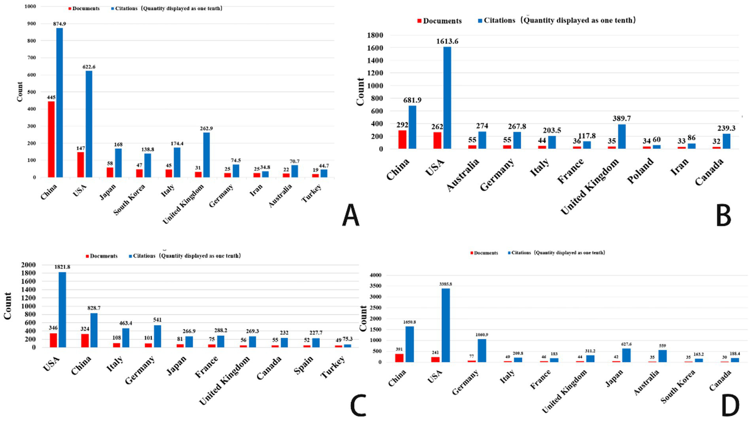 Top 10 countries/regions related to gastric cancer, prostate cancer, leukemia, and brain tumor. (A) Ferroptosis research in gastric cancer. (B) Ferroptosis research in prostate cancer. (C) Ferroptosis research in leukemia. (D) Ferroptosis research in brain tumors.