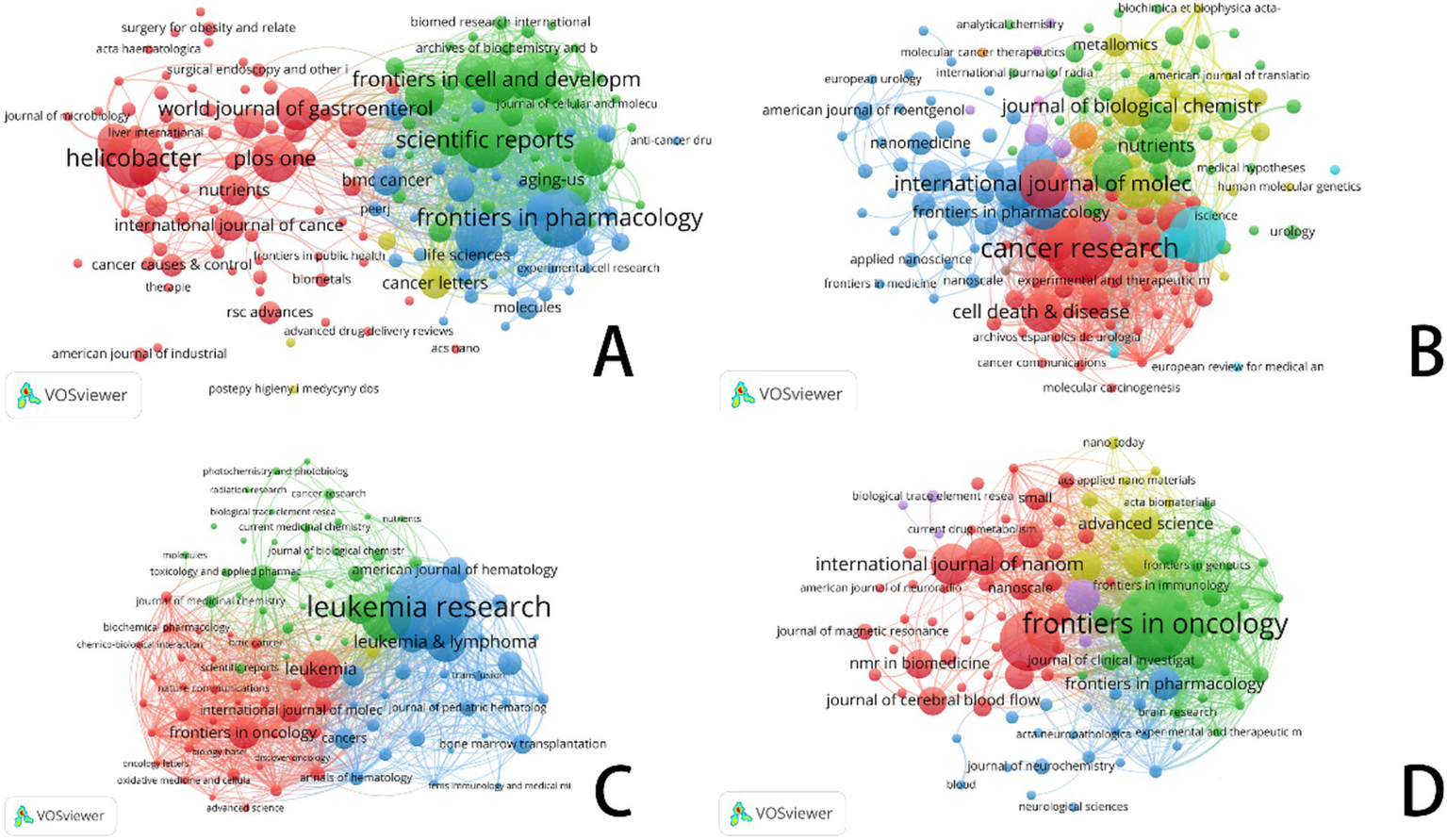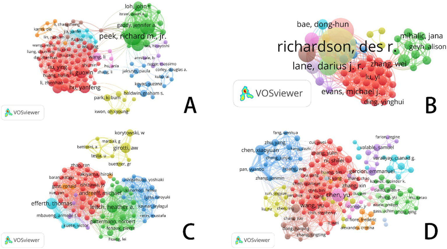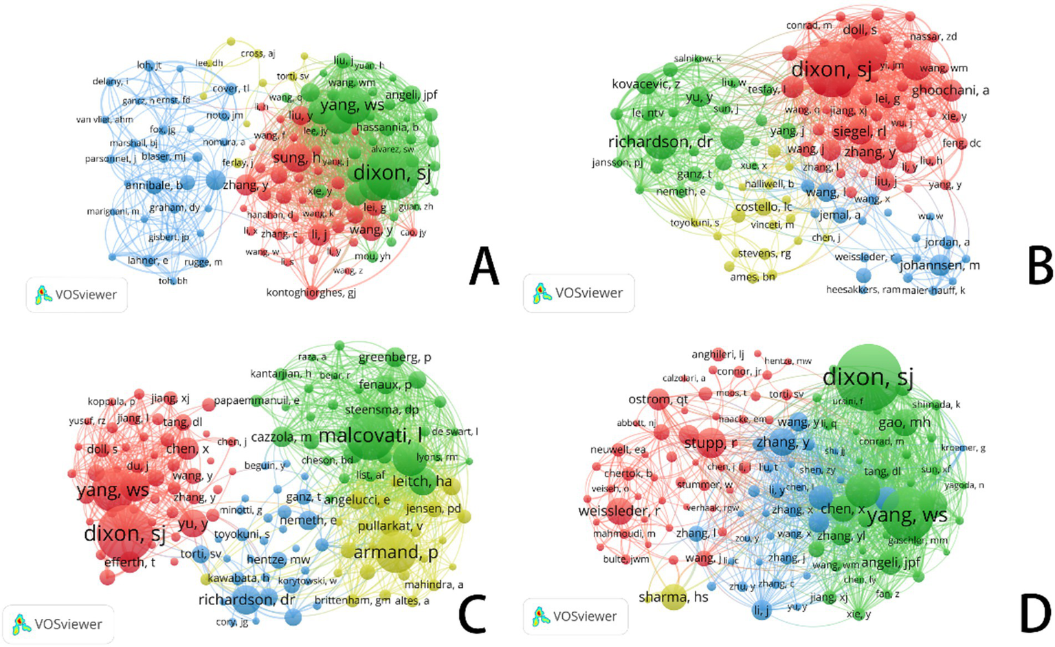 VOSviewer: collaborative networks of ferroptosis research authors in different cancer types (2014–2024). (A) Ferroptosis research in gastric cancer. (B) Ferroptosis research in prostate cancer. (C) Ferroptosis research in leukemia. (D) Ferroptosis research in brain tumors.