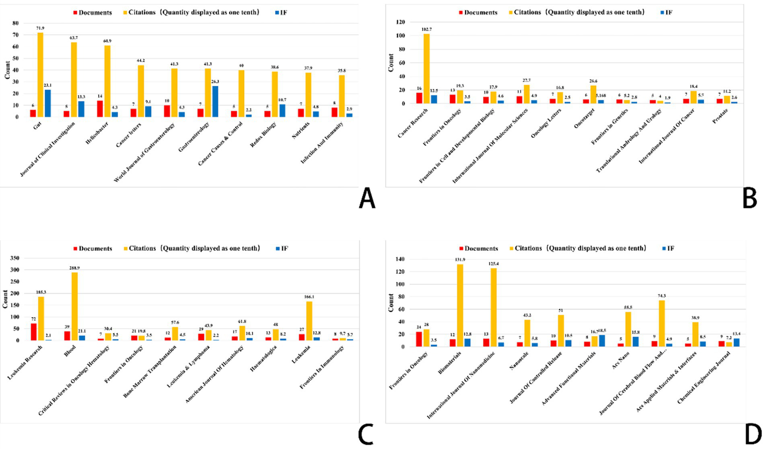 Top 10 organizations related to gastric cancer, prostate cancer, leukemia, and brain tumor. (A) Ferroptosis research in gastric cancer. (B) Ferroptosis research in prostate cancer. (C) Ferroptosis research in leukemia. (D) Ferroptosis research in brain tumors.
