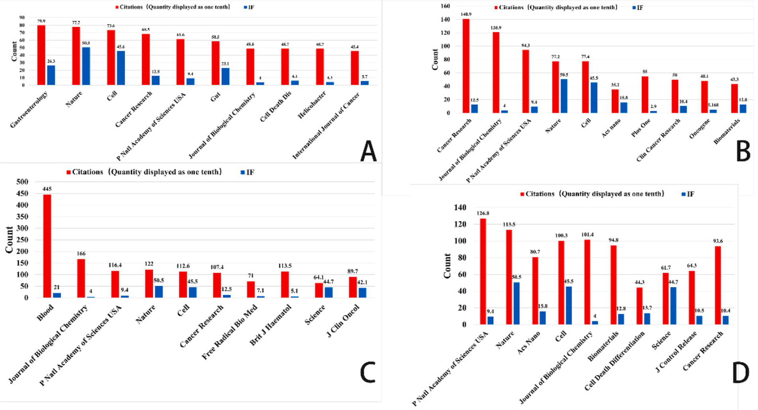 In leukemia research (Figure 4C), the nodes within the research group are densely connected, indicating frequent academic cooperation among group members. This dense network highlights the strong influence of these research groups within the academic community. Compared to gastric and prostate cancer, leukemia research on ferroptosis has demonstrated relatively intensive academic exchanges and collaboration, though it remains in a developmental stage. The author cooperation network suggests that as recognition of the role of ferroptosis in leukemia treatment continues to grow, this field is likely to attract more emerging scholars, driving further research and the development of novel treatment approaches. With continued progress in clinical translational research and drug development, the application of ferroptosis in leukemia is expected to become a focal point in the near future.