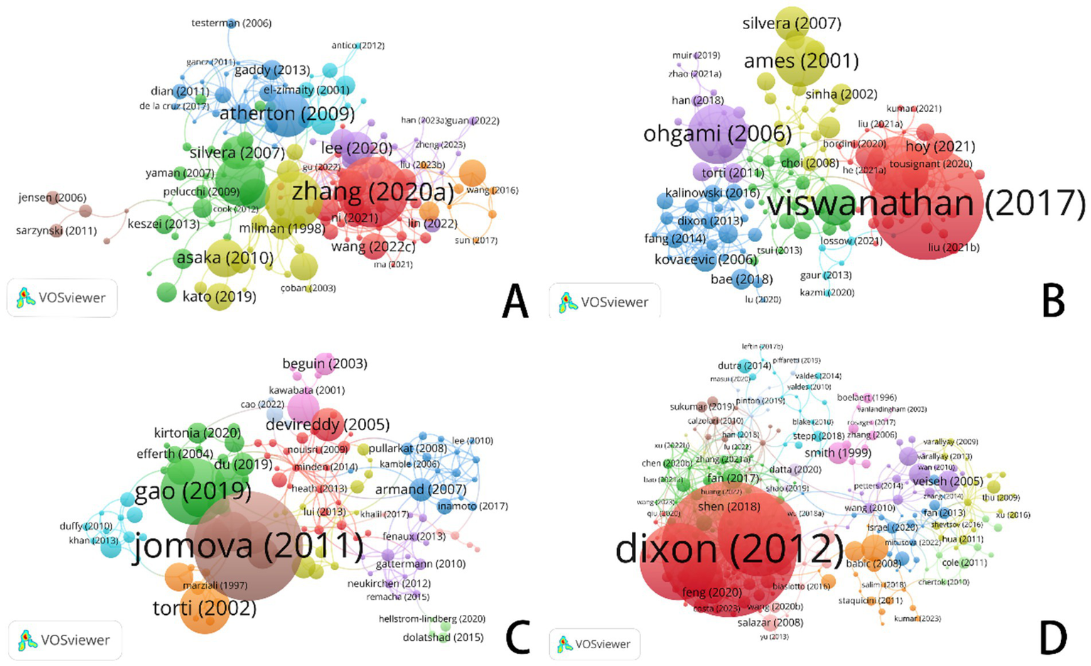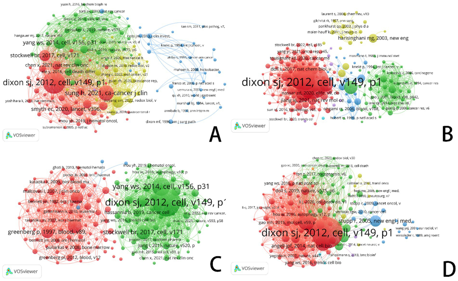 VOSviewer: co-citation network analysis of ferroptosis research authors in different cancer types. (A) Ferroptosis research in gastric cancer. (B) Ferroptosis research in prostate cancer. (C) Ferroptosis research in leukemia. (D) Ferroptosis research in brain tumors.