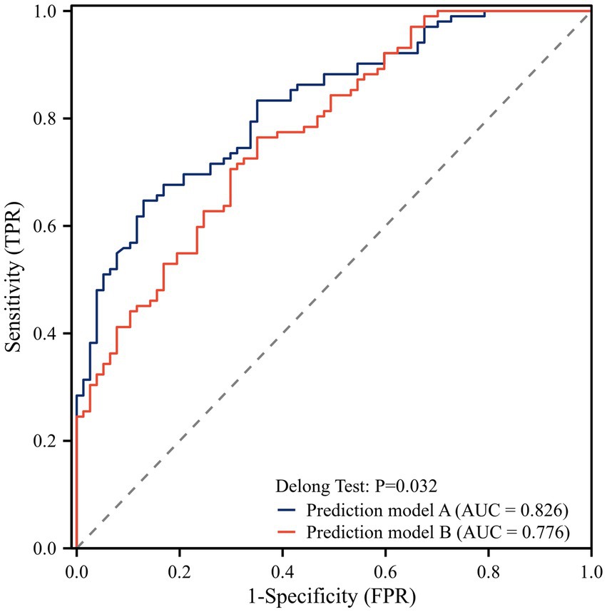 Based on the results of univariate logistic regression analysis, we performed the multivariable logistic regression analysis using forward stepwise selection. The final model included onset symptoms, hypertension, midline shift, admission NIHSS score, and TyG index as independent variables (Table 2). To evaluate the added value of the TyG index in outcome prediction, we compared two prediction models: one with and one without the TyG index. The ROC curve analysis showed that the model including the TyG index had a significantly higher AUC (0.826) compared to the model without TyG index (0.776). The DeLong test confirmed that this difference was statistically significant (p = 0.032), suggesting that the addition of the TyG index significantly improved the predictive performance of the model for outcomes after thrombectomy (Figure 3).