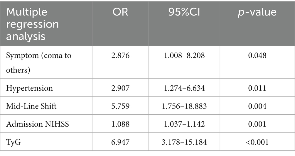 The receiver operating characteristic (ROC) curve analysis was performed to determine the optimal cut-off value of the TyG index for predicting poor outcomes after EVT. The optimal cut-off value was determined using the Youden index method (J = sensitivity + specificity − 1), which identifies the threshold that maximizes the sum of sensitivity and specificity, thus providing the best discrimination between patients with favorable and poor outcomes. This approach ensures an optimal balance between true positive and true negative rates while minimizing both false positive and false negative classifications. The area under the ROC curve AUC was used to evaluate the reliability of the prediction models. The multivariable forward stepwise logistic regression analysis was used to assess the associations between clinical characteristics. Given our sample size of 179 patients with 102 poor outcome events, we followed the guideline of requiring at least 10 events per variable to avoid overfitting (19). Variables for inclusion in the multivariate logistic regression model were selected based on a two-step approach: (1) variables with a p-value of <0.05 in univariate analysis were considered as candidates and (2) final variable selection was based on both statistical significance and clinical relevance established in previous stroke outcome studies (6). The selected variables included onset symptoms, hypertension, midline shift, admission NIHSS score, and TyG index. This approach ensures adequate statistical power while maintaining clinical interpretability (20).