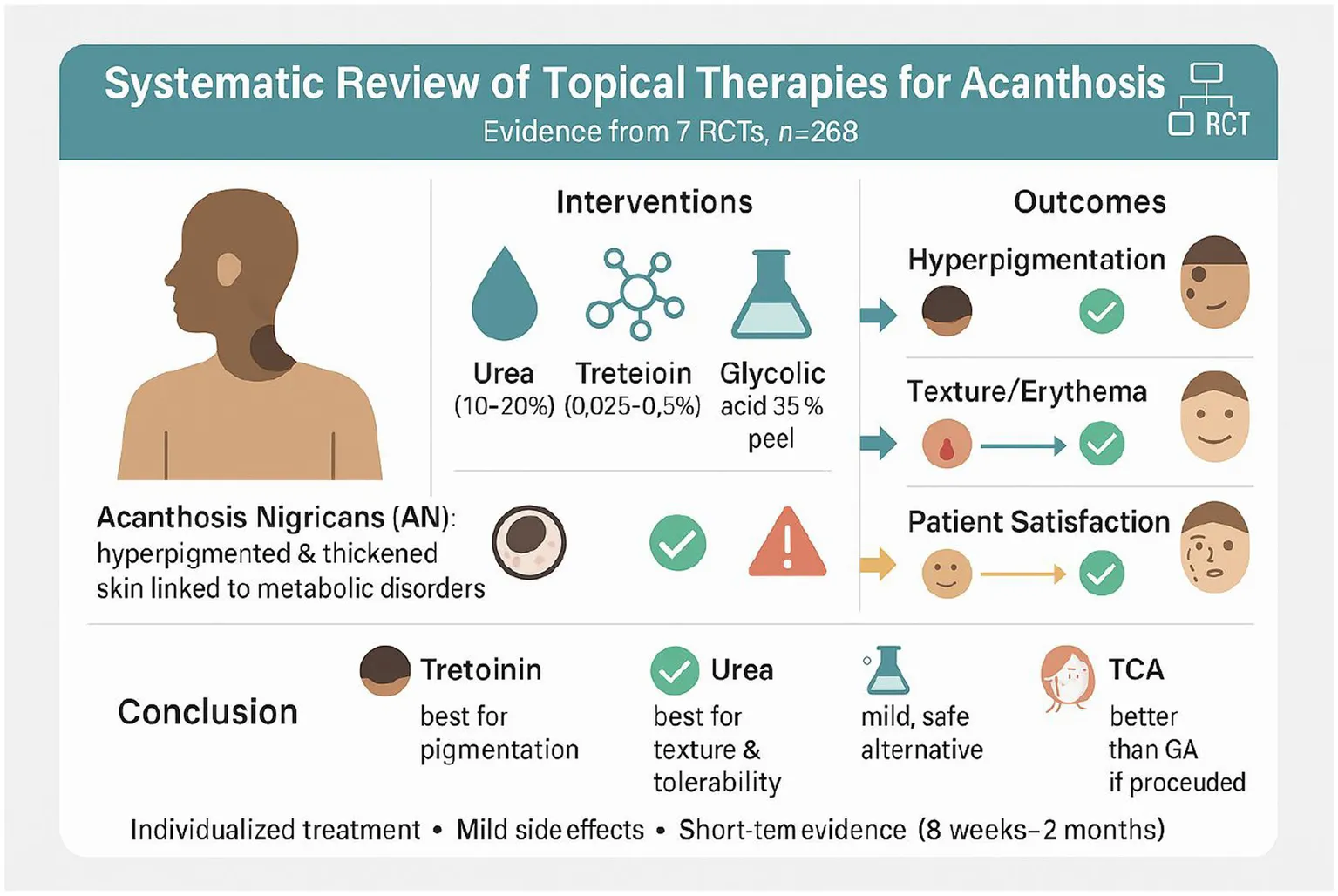 Acanthosis nigricans (AN) is a skin disorder marked by darkening and thickening of the skin, often linked to metabolic abnormalities. This systematic review of randomized controlled trials (RCTs) assesses the comparative effectiveness and tolerability of different topical treatment options of AN, aiming to determine the most suitable therapeutic strategies.