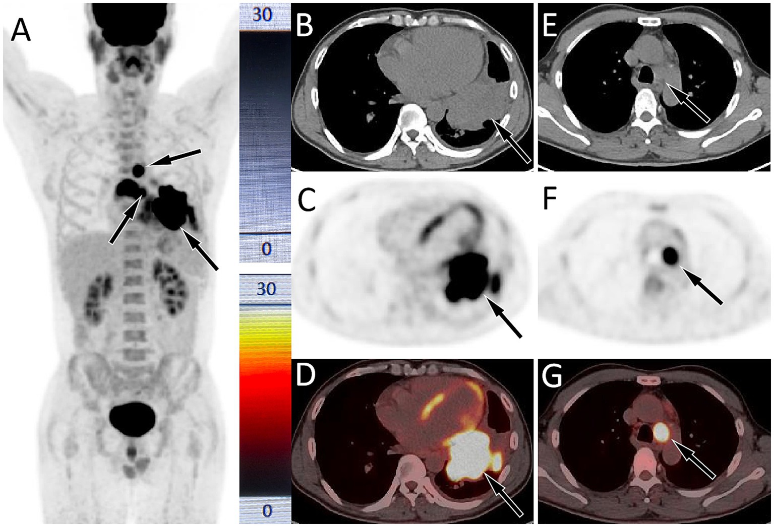 Figure 1. Fluorine-18 fluorodeoxyglucose (18F-FDG, with 314.5 MBq of injected activity) positron emission tomography (PET)/CT imaging of the patient on August 24, 2020; The maximum intensity projection (MIP, A) showed multiple significantly increased 18F-FDG uptake in the chest (arrows). Axial CT (B) showed a soft tissue density mass in the left portal area of the lung (arrow). The corresponding lesion had significantly increased 18F-FDG uptake on axial PET (C, arrow) and PET/CT fusion (D, arrow), with a maximum standardized uptake value (SUVmax) of 29.5. (E) Axial CT also showed an enlarged lymph node in the mediastinum, with a short-axis of about 2.0 cm; which was significantly increased 18FDG uptake on PET (F) and PET/CT (G), with a SUVmax of 25.3.