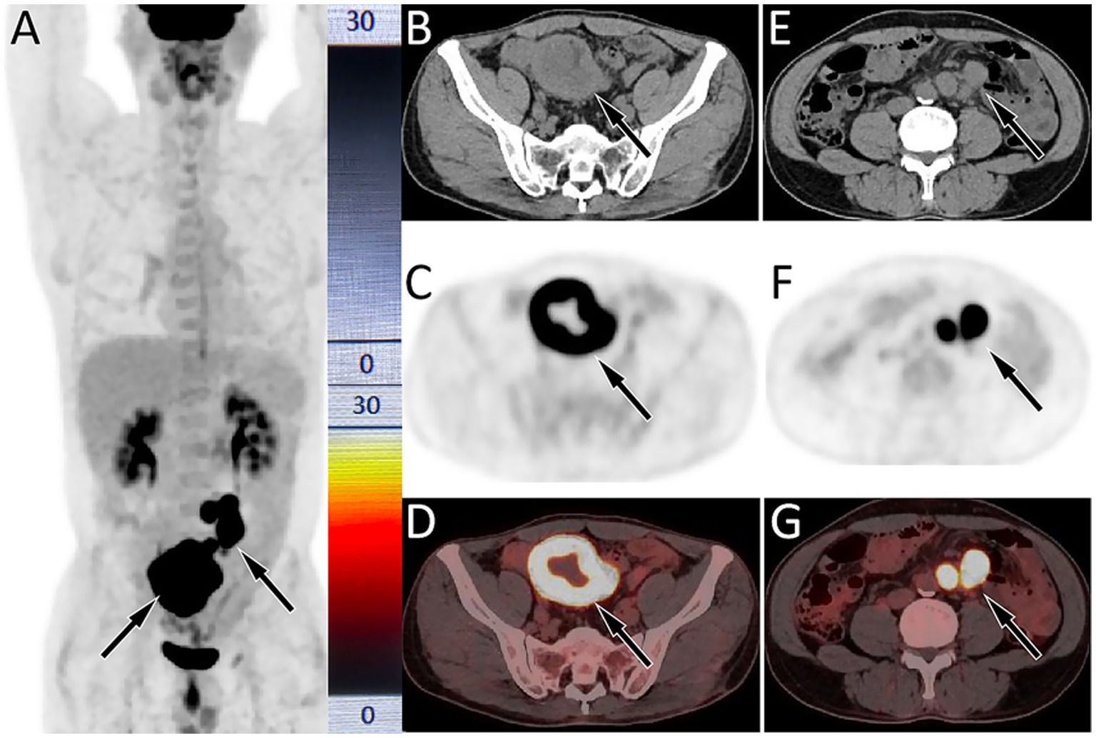 Figure 2. 18F-FDG PET/CT imaging (injected activity is 303.4 MBq) on February 21, 2024; The MIP (A) showed multiple significantly increased 18F-FDG uptake in the middle and lower abdomen (arrows). Axial CT (B) showed uneven annular thickening of the small bowel near the ileocecal region (arrow). The corresponding lesion had obviously increased 18F-FDG uptake on axial PET (C, arrow) and PET/CT fusion (D, arrow), with a maximum standardized uptake value (SUVmax) of 22.1. (E) Axial CT also showed multiple enlarged lymph node adjacent to the abdominal aorta (arrows); which were significantly increased 18FDG uptake on PET (F) and PET/CT (G), with a SUVmax of 21.6.