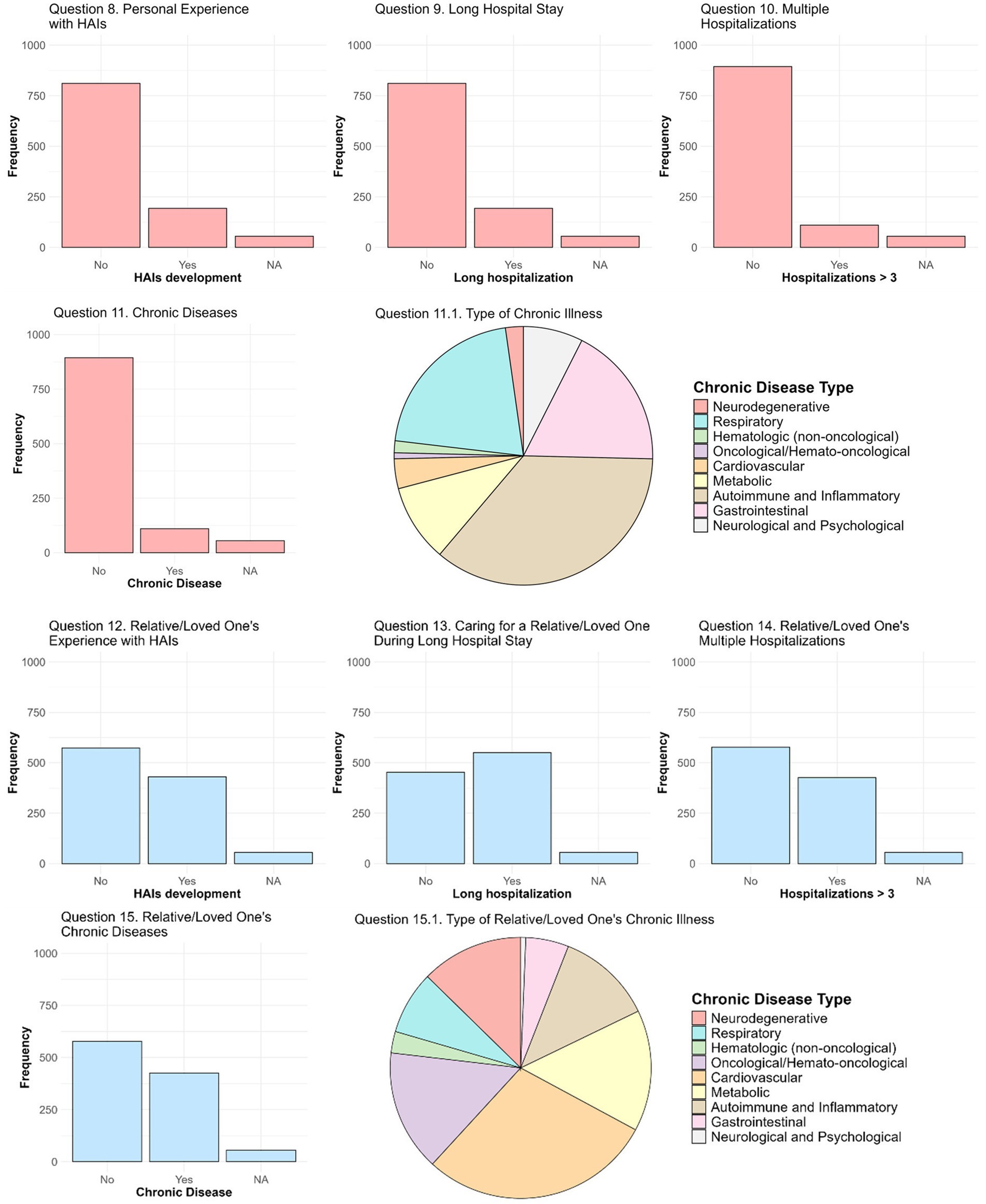 Figure 1. Medical history of students and their relatives/loved ones. The responses to Questions 8, 9, 10, and 11 are shown in pink bar charts, addressing the development of HAIs in students, the occurrence of a long hospitalization, the number of prolonged hospitalizations, and the presence of chronic diseases, respectively. The pie chart (Question 11.1) depicts the distribution of the types of chronic diseases reported by students. The responses to Questions 12, 13, 14, and 15 are shown in light-blue bar charts, addressing the following aspects: the development of HAIs in a student’s relative/loved one, the need to take care of a students’ relative/loved one during one long hospitalizations, the number of prolonged hospitalizations in a student’s relative/loved one, and the presence of chronic diseases in a student’s relative/loved one, respectively. The pie chart (Question 15.1) illustrates the distribution of the types of chronic diseases reported for the students’ relatives/loved ones.