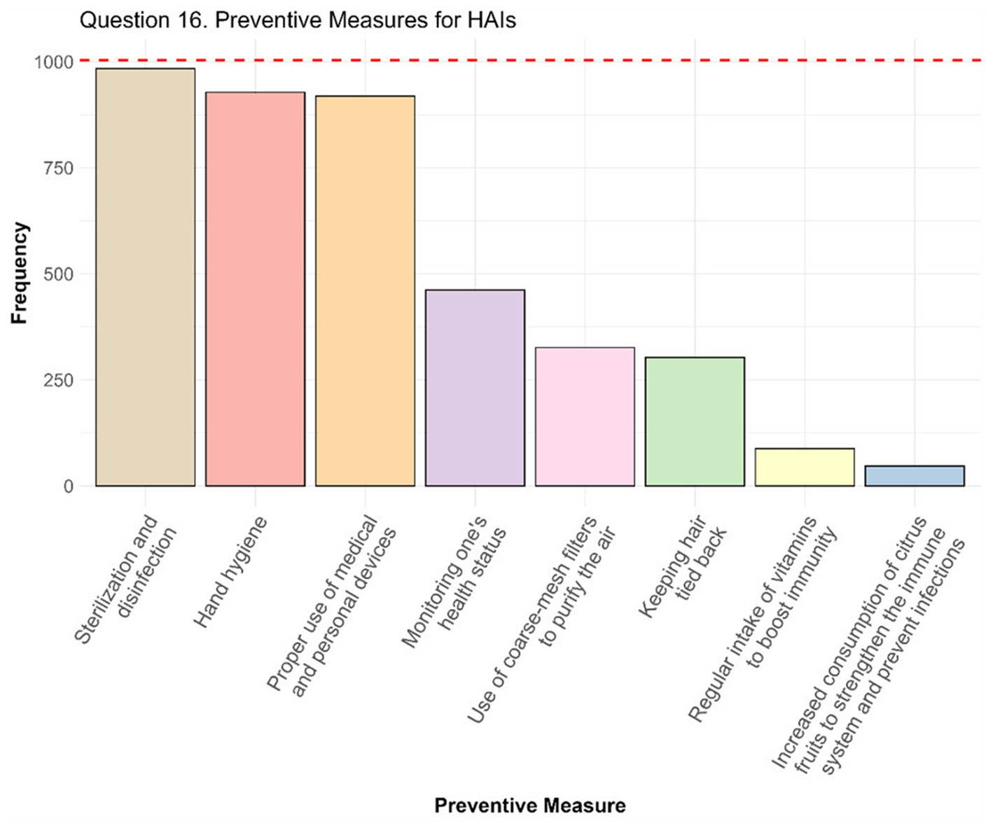 Figure 2. Preventive measures for HAIs. In the bar chart the number of responses obtained for each preventive measure are represented. The red dot line represents the total number of students who answered the question, thus the maximum number of individuals who could have selected each option.