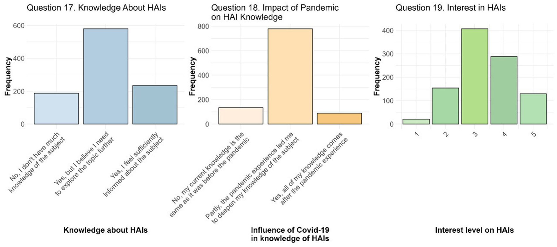 Figure 3. Awareness and knowledge of HAIs. The image presents responses to Question 17, which explores students’ personal perception of their knowledge about HAIs; Question 18, which highlights the impact of the COVID-19 pandemic on their understanding of HAIs; and Question 19, which reflects what students think is the current interest on HAIs.