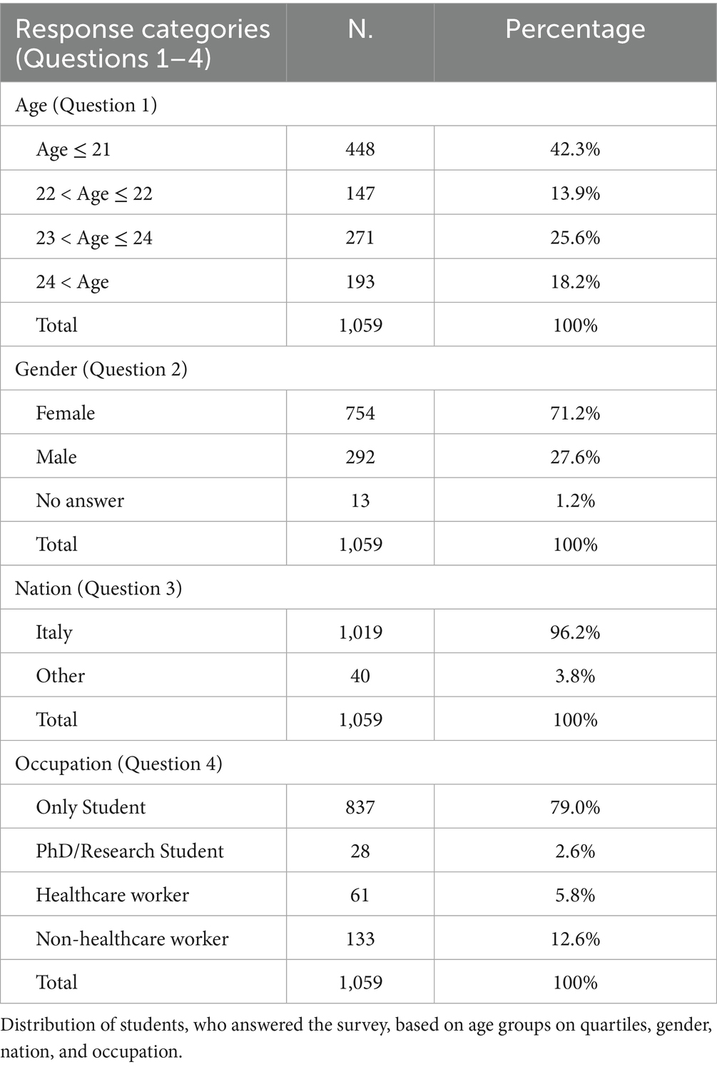 A total of 1,059 students from the University of Padua answered the survey, although not all of them completed every question. Specifically, all 1,059 students answered questions 1 to 7, while 1,004 provided responses to questions 8 to 16. For questions 17 to 23, the number of respondents slightly decreased, ranging between 1,001 and 1,003. All analyses were conducted using the number of respondents available for each question or combination of variables. Considering the total number of students enrolled in the degree courses to whom the email with the link of the survey was sent, it is estimated that the survey reached approximately 7,000 students, resulting in an estimated response rate of 15.13%. The students’ ages range from 18 to 59 years, with a mean age of 23.4 years and a standard deviation (st. dev.) of 5.5 years. The distribution of students based on age groups on quartiles, gender, nationality, and occupation (Question 1–4) is described in the table below (Table 1).