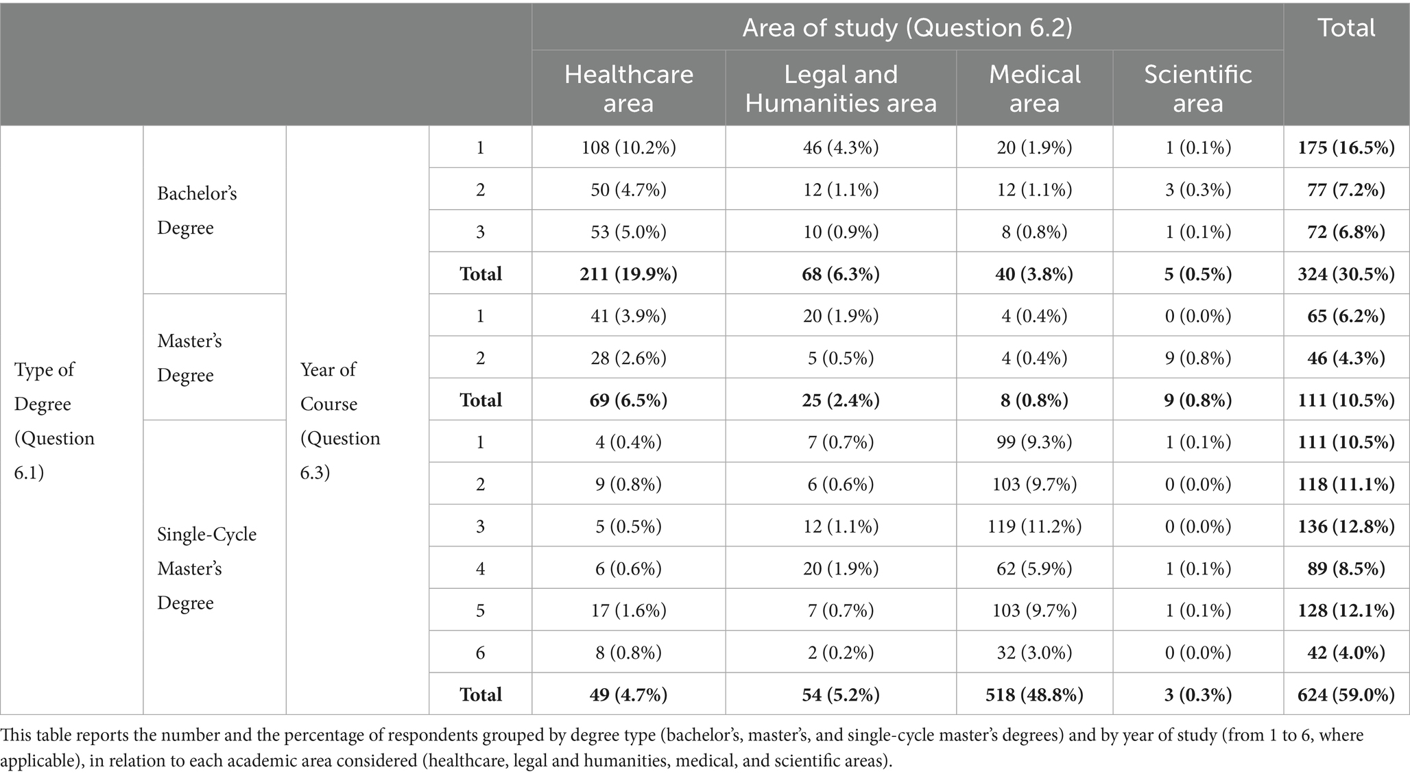 The results of the distribution of responses by type of degree (Question 6.1), area of study (Question 6.2), and year of study (Question 6.3) are shown in Table 2. These results provided interesting insights into the characteristics of the survey participants, reflecting both their affiliation with different disciplinary areas and how these categories were distributed according to the type of degree and the year of study. When reporting the results obtained, we will refer to students enrolled in the degree course in Medicine and Surgery and the degree course in Dentistry as “Medical area” students, while the term “Healthcare area” will refer to students enrolled in degree courses for non-medical healthcare professions. In all models, if the study area was considered, the Healthcare area is used as the reference category, in other cases the opposite scenario described was used (example: Having a loved one with a chronic disease was compared with not having a loved one with a chronic disease). Among those enrolled in three-year degree courses, the first year was dominated by students from the healthcare area, followed by those from the legal and humanities area and medical area. In master’s courses, the healthcare area remains prevalent, but with an increased presence of the scientific area in the second year. In single-cycle master’s courses, the medical area showed a constant predominance in all years of study.