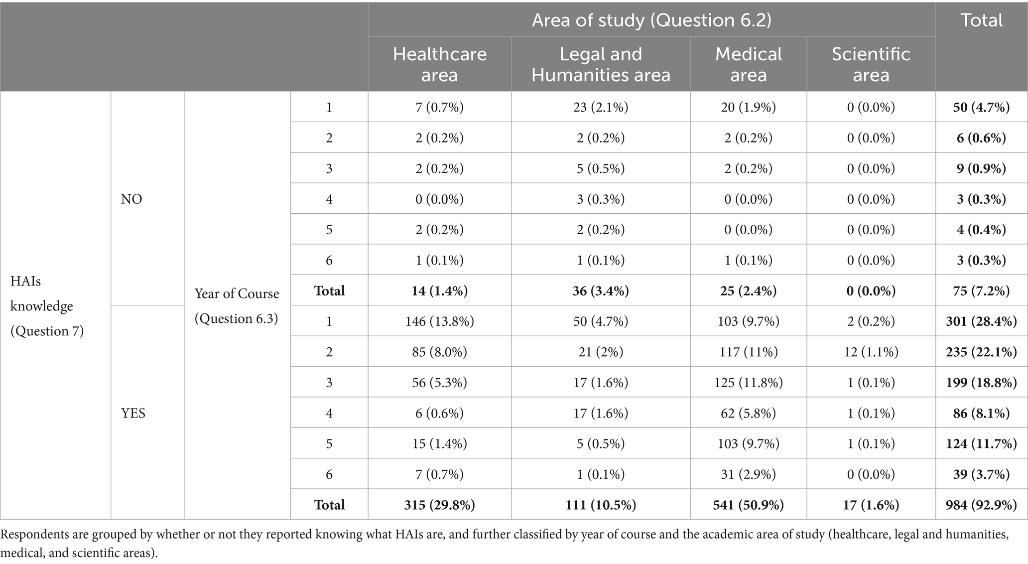 Regarding Question 7, which asked whether students were aware of what HAIs were before reading the provided definition, a total of 984 positive answers (92.9%) and 75 negative answers (7.1%) were recorded. The distribution of these responses, divided by study area (Question 6.2) and year of study (Question 6.3), is presented in Table 3. Although subsequent analyses were performed to evaluate the effect of different independent variables on the knowledge of what HAIs are, an initial examination assessed the influence of factors such as area of study and academic year, given that academic training can significantly shape awareness of health issues such as HAIs (26–28). In particular, to explore whether there was a correlation between students’ declared knowledge of HAIs (yes/no) and their study area, a Fisher’s exact test was performed on the contingency table that compared the responses across the four study areas: healthcare area, legal and humanities area, medical area, and scientific area. The test revealed a highly significant difference between the study areas (p-value = 3.08 × 10–12). Subsequently, to further investigate the differences between these groups, a post-hoc test with Bonferroni correction was performed. The results showed that students from the legal and humanities areas significantly different from those in the healthcare area (p-adj value = 1.58×10-9) and those in the medical area (p-adj value = 2.97×10-11). No other significant differences emerged considering the study areas.