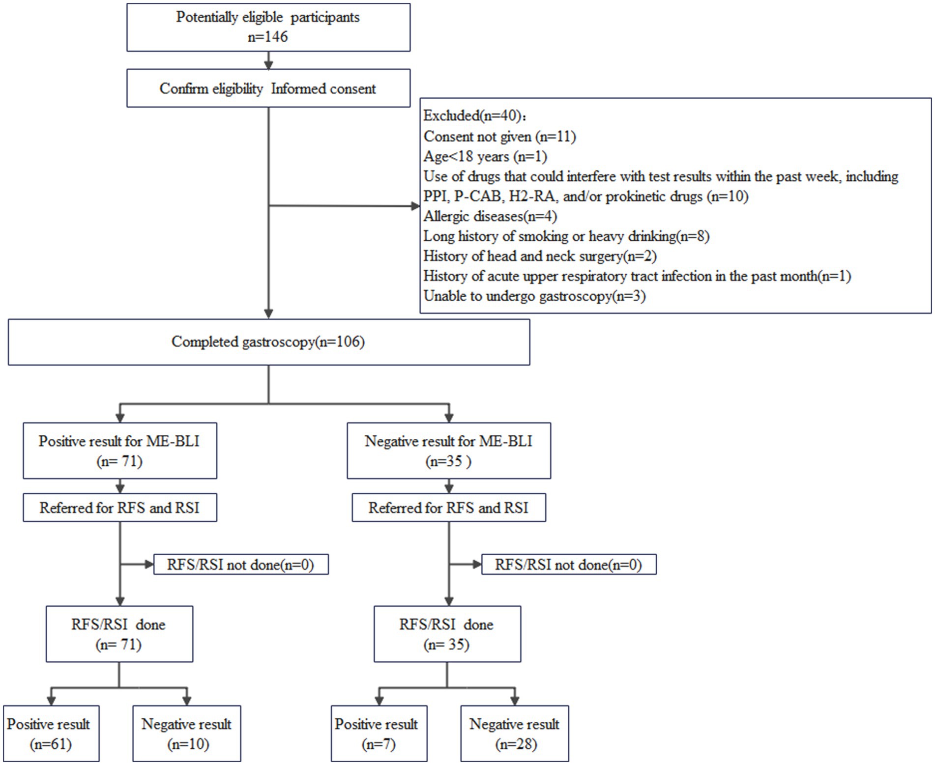 Figure 1. A flowchart of the participant selection process. ME-BLI, magnifying endoscopy with blue laser imaging; RSI, reflux symptom index; RFS, reflux finding score.