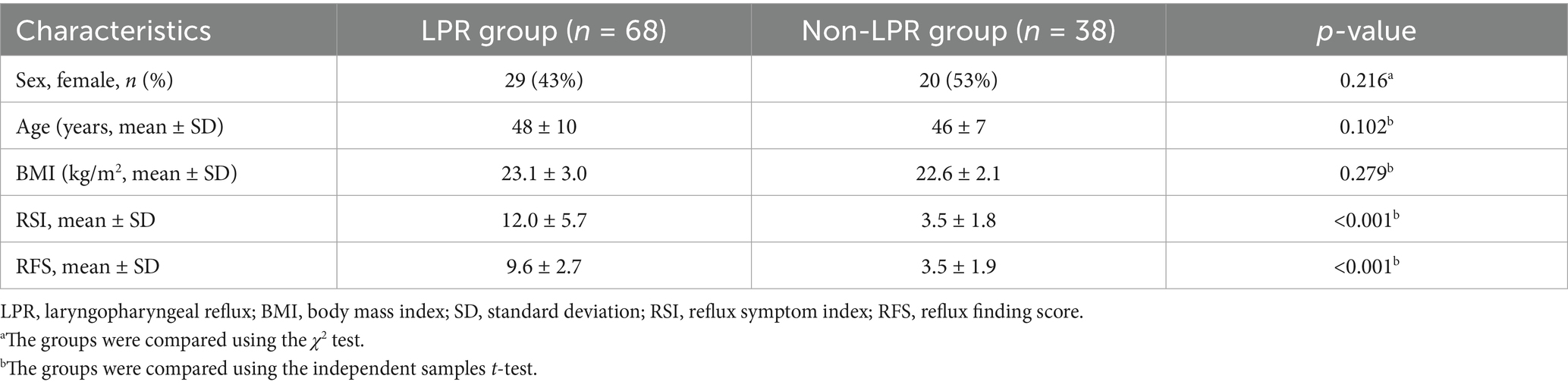 The study included 68 patients with LPR and 38 negative controls (Table 1). The groups were comparable in age, sex, and body mass index (p > 0.05).