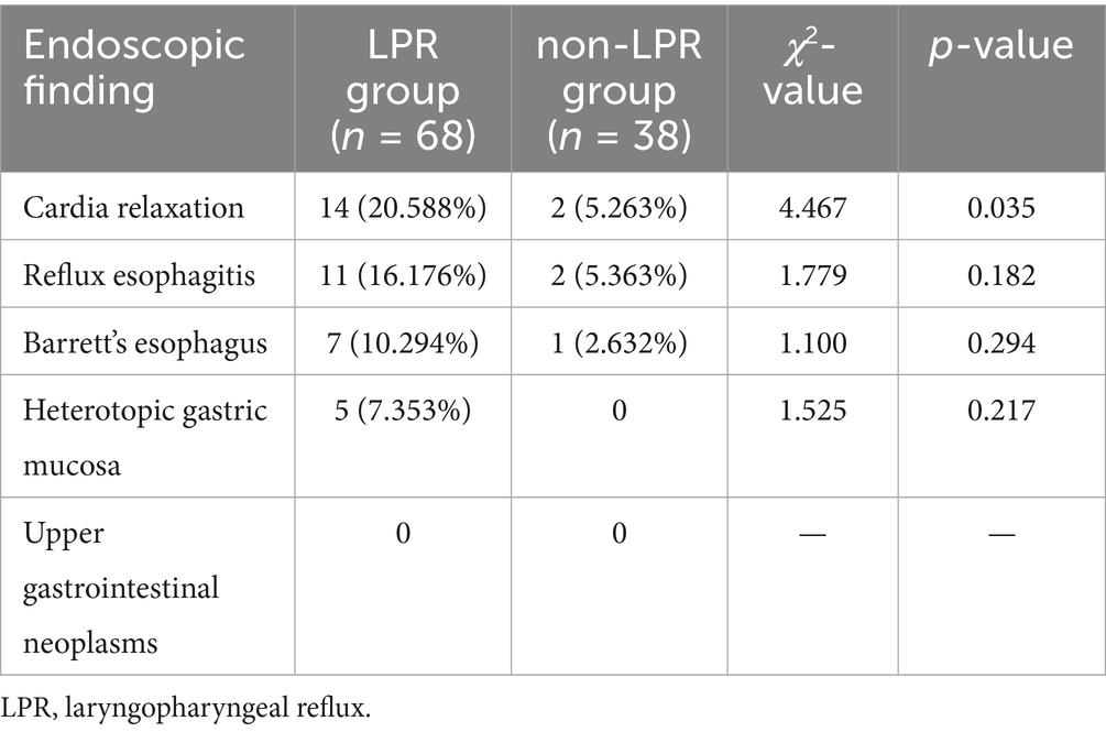 Upper gastrointestinal endoscopy showed that the LPR group had a higher incidence of cardia relaxation than the non-LPR group (p = 0.035; Table 2). No neoplastic diseases of the upper digestive tract were found in either group.