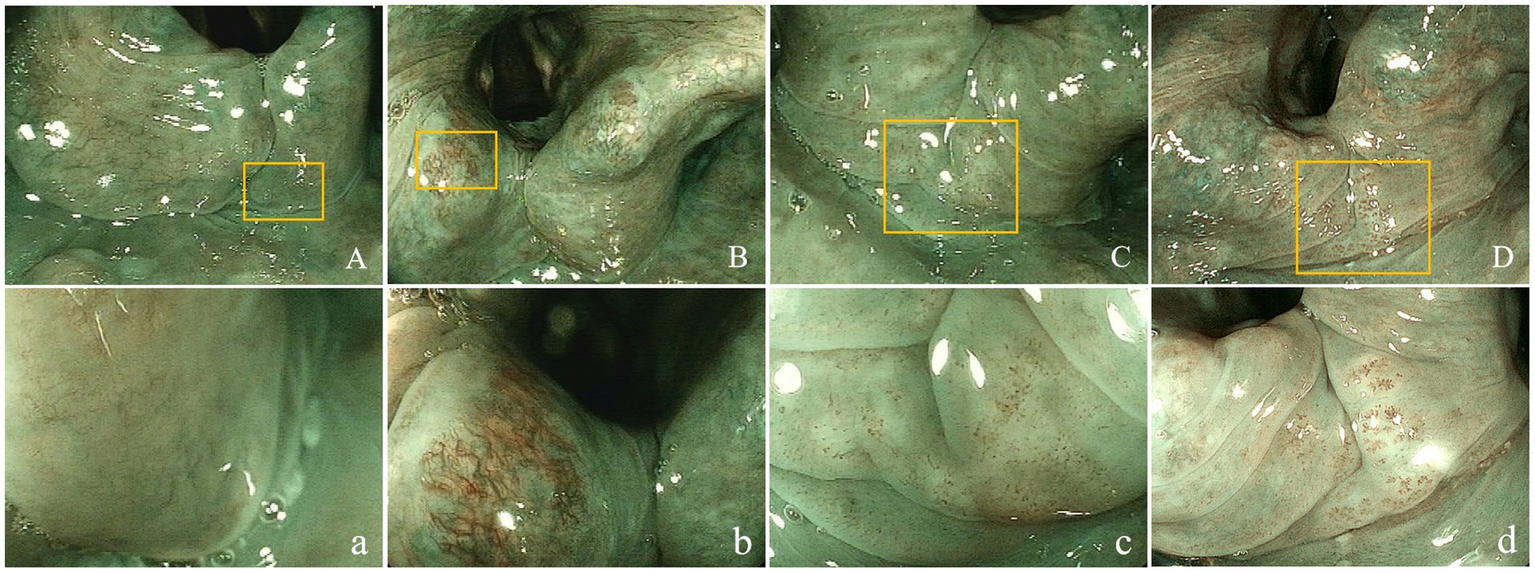 Superficial vascular manifestations of the laryngopharyngeal mucosa. Non-enlarged (A-D) and magnified (400×; a- d) target lesions using ME-BLI. Panels a-d are magnifications of the areas marked with yellow rectangles in panels A-D. (A,a) ME-BLI Grade 1 images that show no IPCLs and clear intramucosal vessels without dilation, tortuousness, or hyperplasia; (B,b) ME-BLI Grade 2 images that show no IPCLs and superficial mucosal blood vessels with hyperplasia, dilation, and tortuousness; (C,c) ME-BLI Grade 3 images that show IPCLs and roughly regularly-arranged and sparsely-distributed brown spots in the post-cricoid region and the inter-arytenoid area; (D,d) ME-BLI Grade 4 images that show IPCLs and roughly regularly-arranged, densely-distributed, and slightly-dilated brown spots in the post-cricoid region and the inter-arytenoid area. ME-BLI, magnifying endoscopy with blue laser imaging; IPCLs, intraepithelial papillary capillary Loops.
