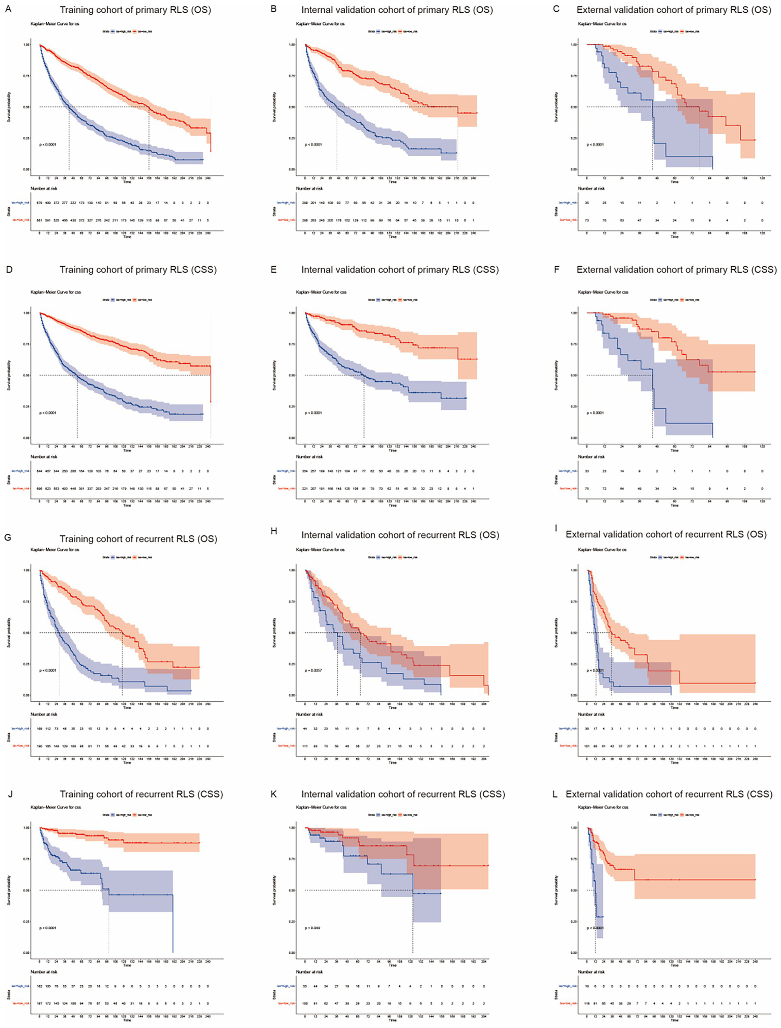 Kaplan-Meier survival curves for RLS patients with different risks stratified by the nomogram. (A) OS probability prediction of primary RLS patients in the training cohort at different risks stratified according to the nomogram. (B–C) OS probability prediction of primary RLS patients in the validation cohorts at different risks stratified according to the nomogram. (D) CSS probability prediction of primary RLS patients in the training cohort at different risks stratified according to the nomogram. (E–F) CSS probability prediction of primary RLS patients in the validation cohorts at different risks stratified according to the nomogram. (G) OS probability prediction of recurrent RLS patients in the training cohort at different risks stratified according to the nomogram. (H–I) OS probability prediction of recurrent RLS patients in the validation cohorts at different risks stratified according to the nomogram. (J) CSS probability prediction of recurrent RLS patients in the training cohort at different risks stratified according to the nomogram. (K–L) CSS probability prediction of recurrent RLS patients in the validation cohorts at different risks stratified according to the nomogram.