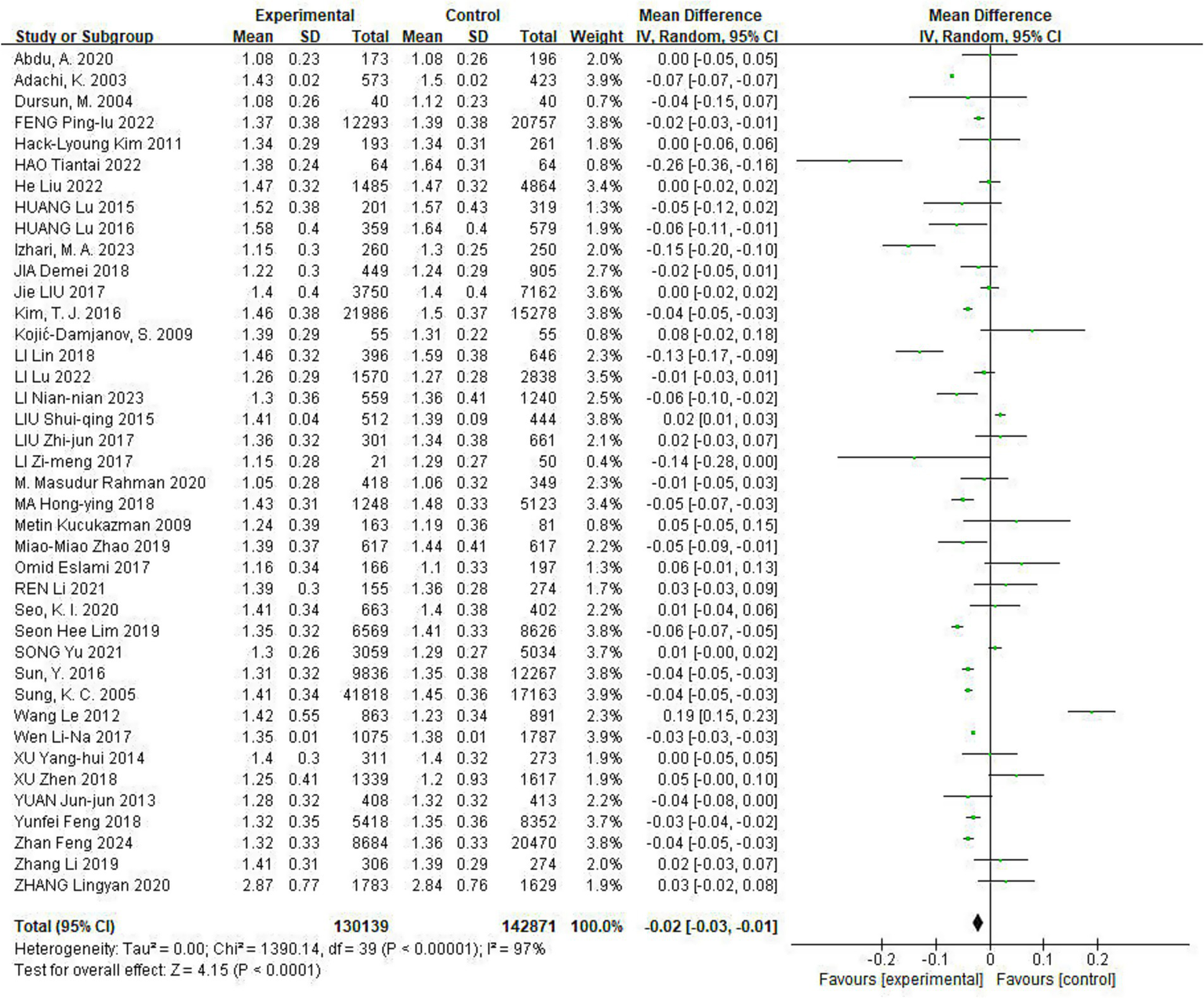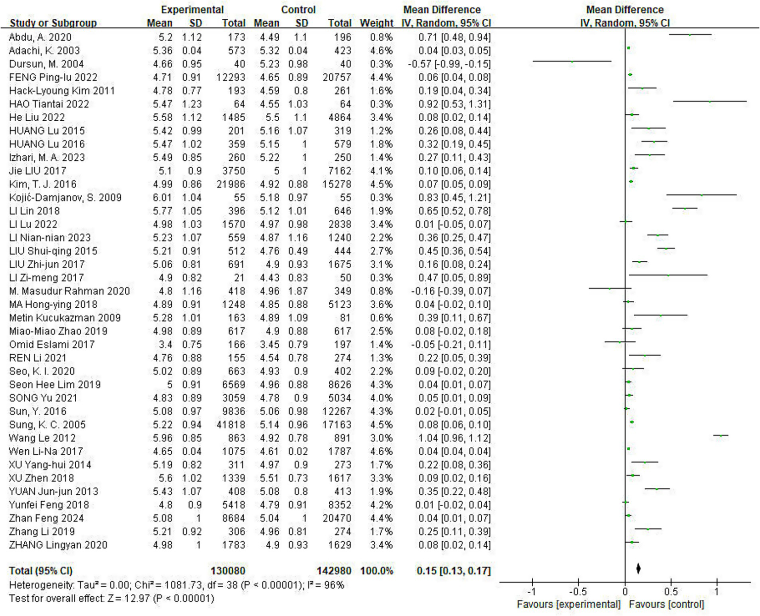 Of the included studies, 39 reported the effect of Hp infection on alterations in TC levels. Heterogeneity was observed among the studies (I2 = 96%, p < 0.05). TC levels were elevated in Hp-infected patients compared to uninfected patients [TC: MD = 0.15, (95%CI: 0.13, 0.17), p < 0.01] (Figure 2).