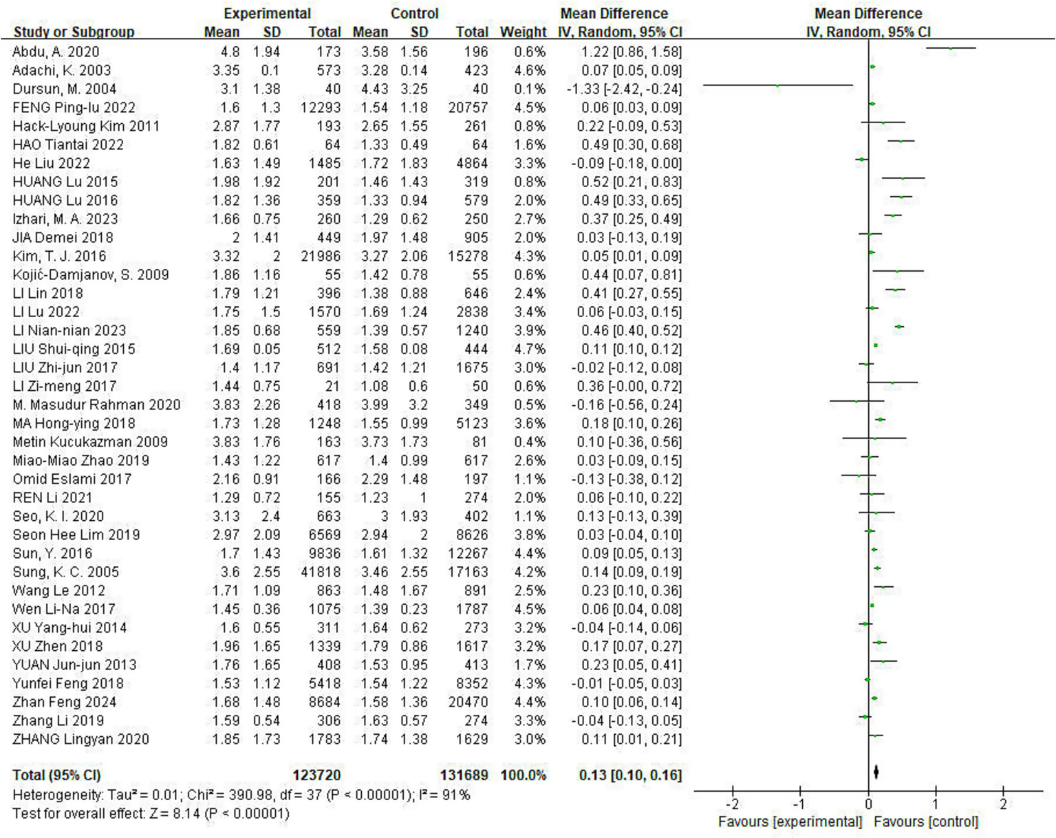 Of the included studies, 38 reported the effect of Hp infection on TG levels, with heterogeneity among the studies (I2 = 91%, p < 0.05). TG levels were elevated in Hp-infected patients compared to uninfected patients [TG: MD = 0.13, (95%CI: 0.10, 0.16), p < 0.01] (Figure 3).