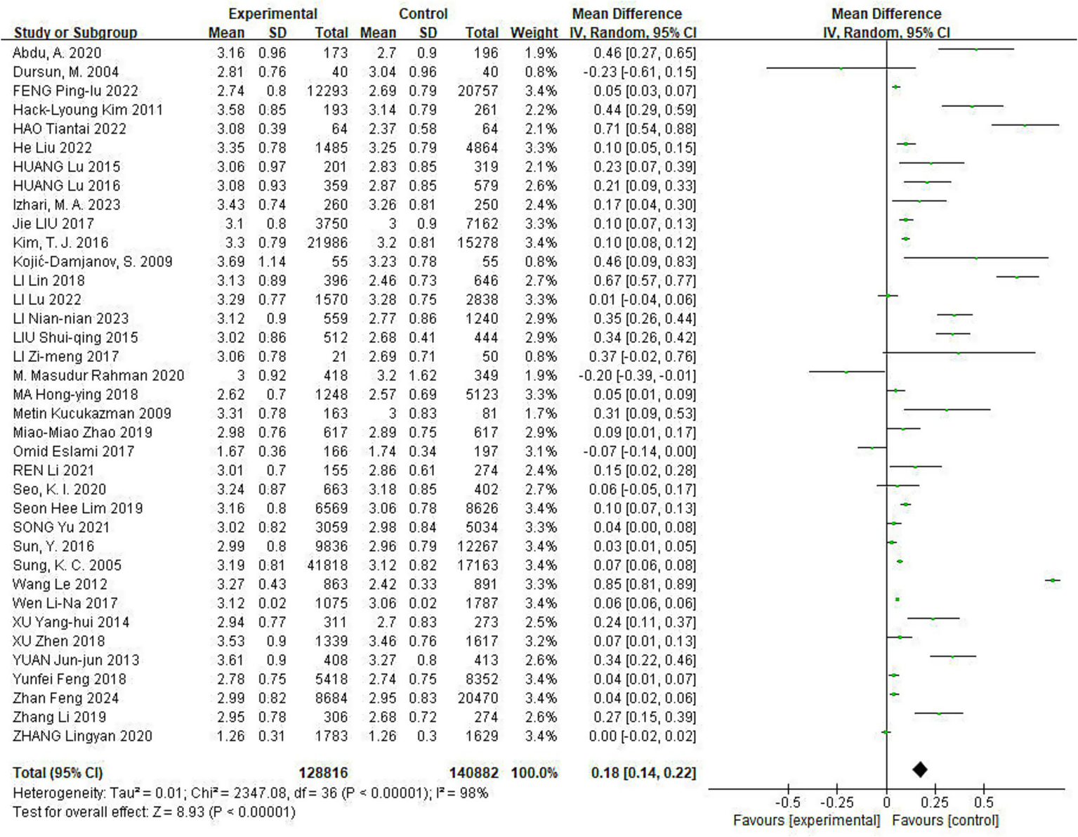 Of the included studies, 37 reported the effect of Hp infection on LDL-C levels. Heterogeneity was observed among the studies (I2 = 98%, p < 0.05). LDL-C levels were elevated in Hp-infected patients compared to uninfected patients [LDL-C: MD = 0.18, (95%CI: 0.14, 0.22), p < 0.01] (Figure 4).