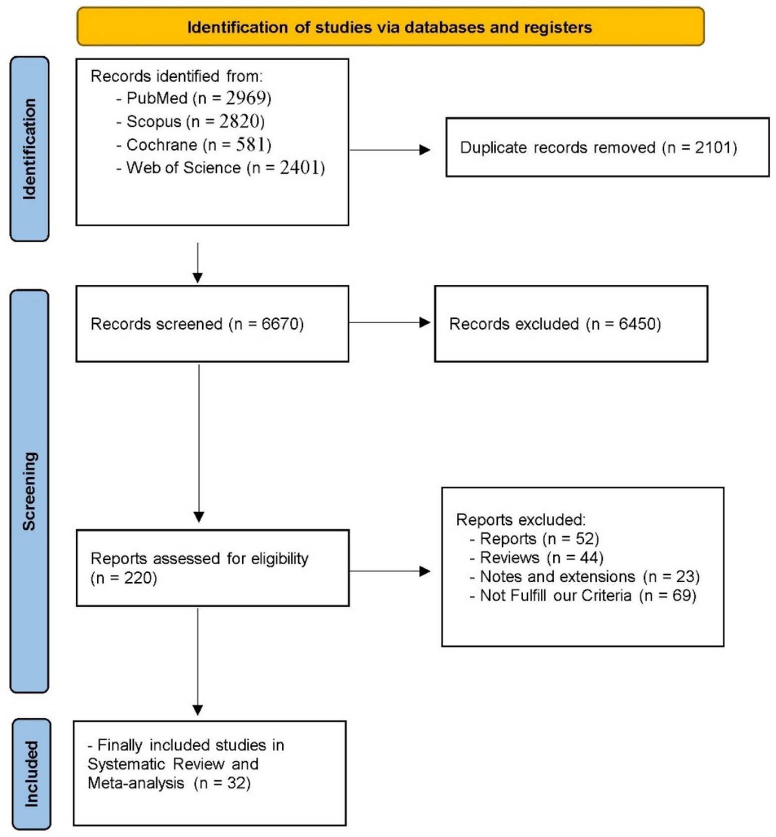 Flowchart depicting the process of identifying studies via databases and registers. Initially, 8,771 records were identified from PubMed, Scopus, Cochrane, and Web of Science. After removing 2,101 duplicates, 6,670 records were screened, with 6,450 excluded. Of the 220 reports assessed for eligibility, 188 were excluded due to reports, reviews, notes, extensions, and unmet criteria. Finally, 32 studies were included in the systematic review and meta-analysis.