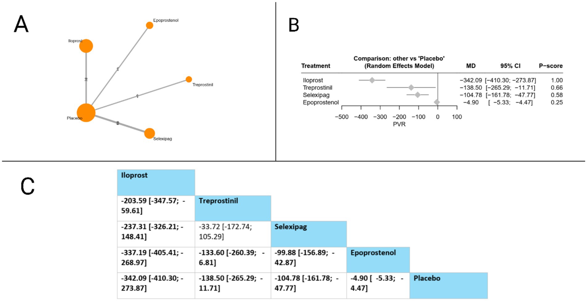 Figure 5. Frequentist random effect model network meta-analysis comparing PVR of prostanoid therapies, showing (A) treatment connections in network plot, (B) forest plot of relative risks versus placebo, and (C) net league matrix of pairwise comparisons with 95% confidence intervals.