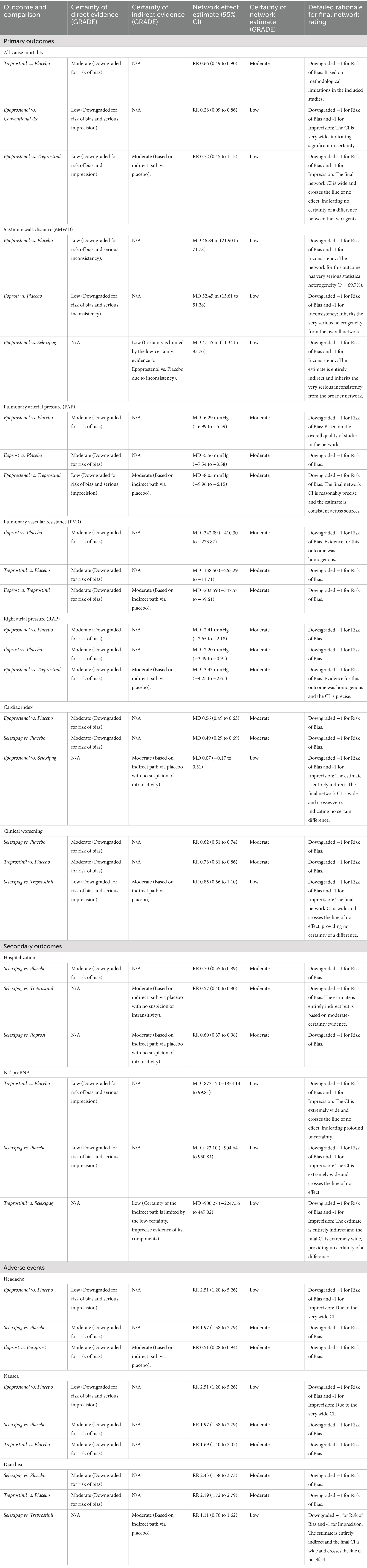 Results: Our NWM comprising 32 studies (N = 7,819) revealed significant mortality reduction with treprostinil versus placebo (RR 0.66, 95%CI 0.49–0.90), while epoprostenol transitioned demonstrated superior survival benefit (P-score 0.78). For functional capacity, epoprostenol exhibited the greatest 6-Minute Walking Distance (6MWD) improvement (46.84 m, 95%CI 21.90–71.78; P-score 0.90) versus placebo. Hemodynamically, epoprostenol achieved optimal Pulmonary Arterial Pressure (PAP) reduction (−6.29 mmHg, 95%CI -6.99 to −5.59; P-score 0.95), while iloprost demonstrated superior Pulmonary Vascular Resistance (PVR) improvement (−342.09, 95%CI -410.30 to −273.87; P-score 1.00). Epoprostenol ranked highest for Right Atrial Pressure (RAP) reduction (−2.41 mmHg, 95%CI -2.65 to −2.18) and cardiac index improvement (0.56, 95%CI 0.49–0.63). Regarding clinical worsening, selexipag showed potential superiority (RR 0.62, 95%CI 0.51–0.74; P-score 0.95) compared to treprostinil (P-score 0.55).