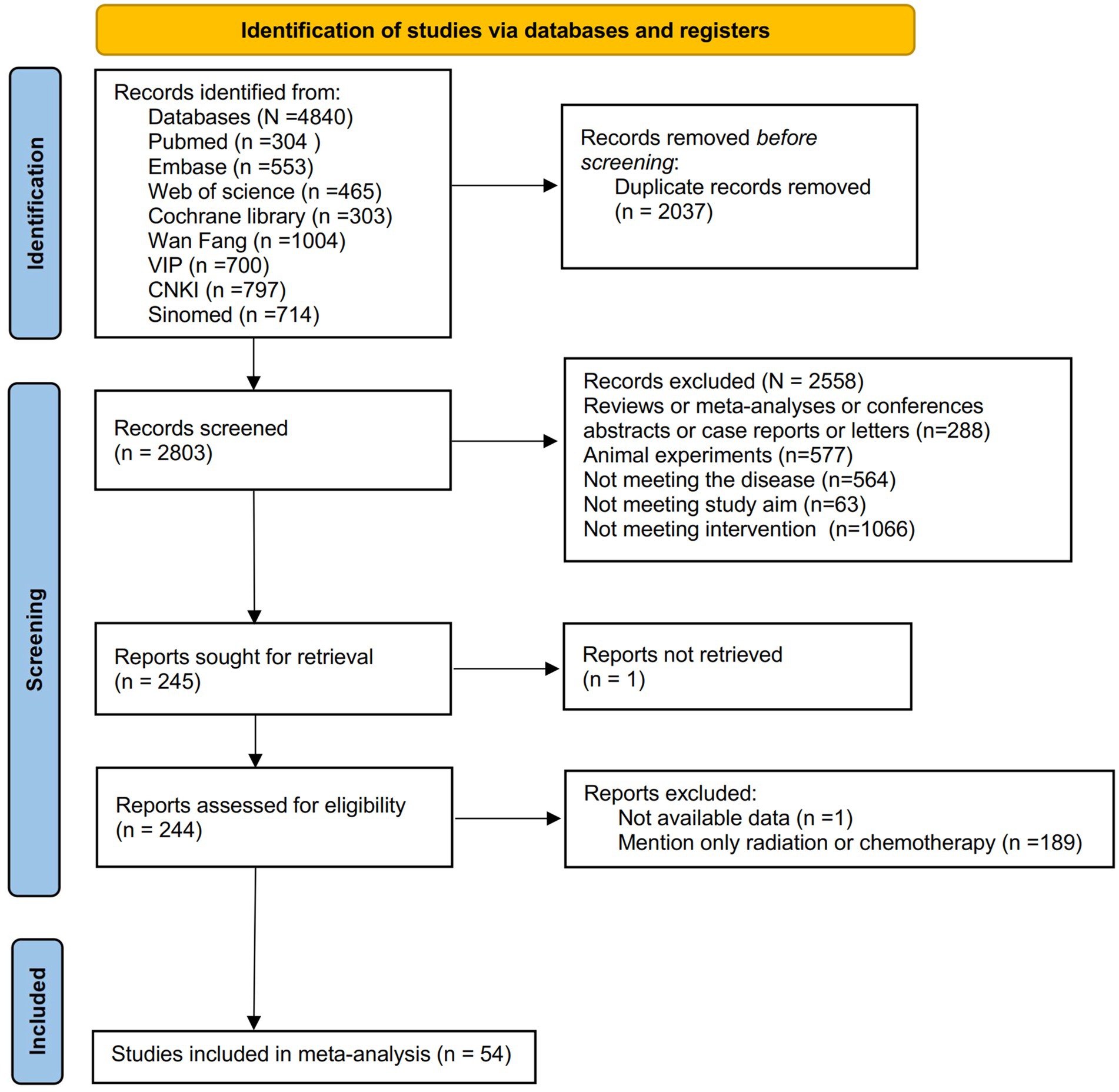 4,840 articles were identified initially after a literature search. Following the removal of 2,037 duplicates, 2,558 articles were deleted after a review of titles and abstracts. Subsequently, the full texts of the remaining publications were assessed for eligibility. Ultimately, 54 studies (46–99) were eligible. The literature screening process is illustrated in Figure 1.